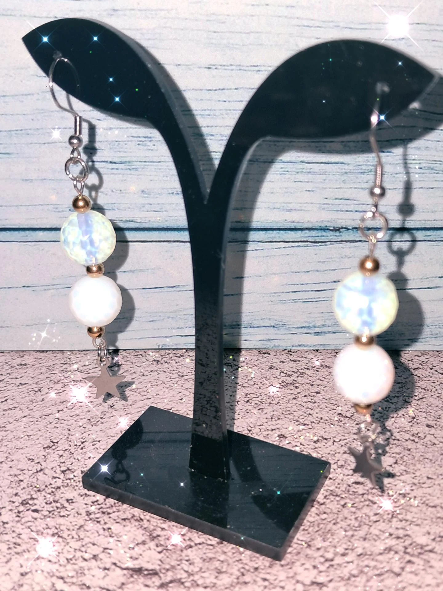 Boucles d'oreilles délicates en acier inoxydable ornées de perles d'opale blanches à facette et d'un pendentif étoile.Un bijou raffiné et lumineux qui symbolise pureté ,équilibre & reve.