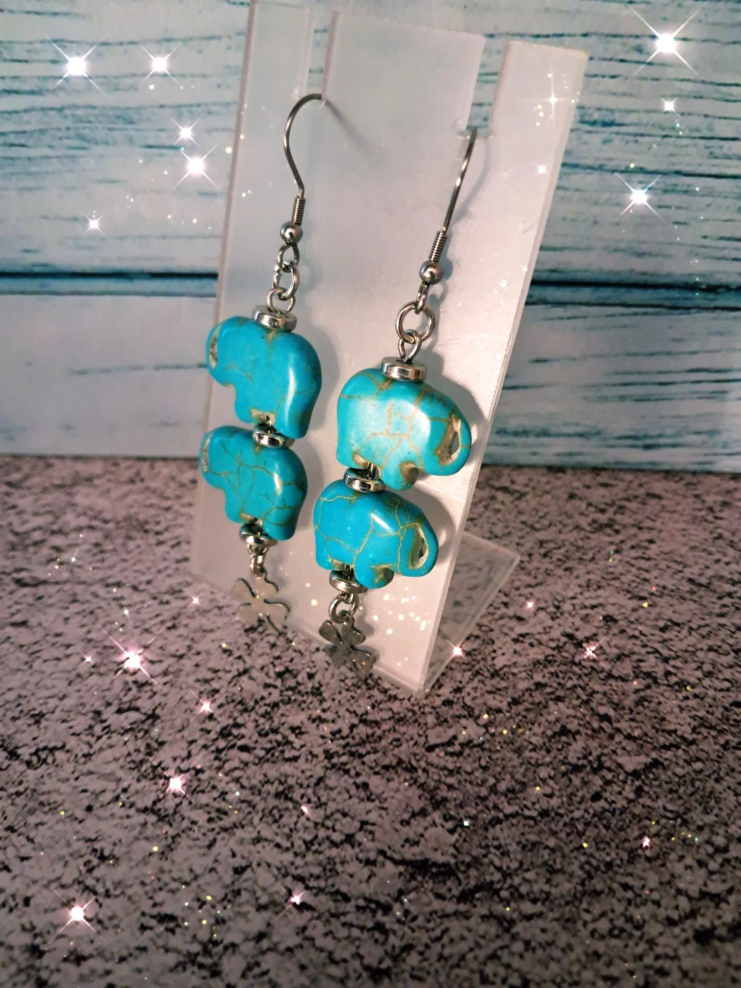 Boucles d'oreilles bohèmes en pierre de turquoise reconstituée,ornées d'un pendentif éléphant sur monture en acier inoxydable.Un bijou porte bonheur aux couleurs apaisantes & au style unique.