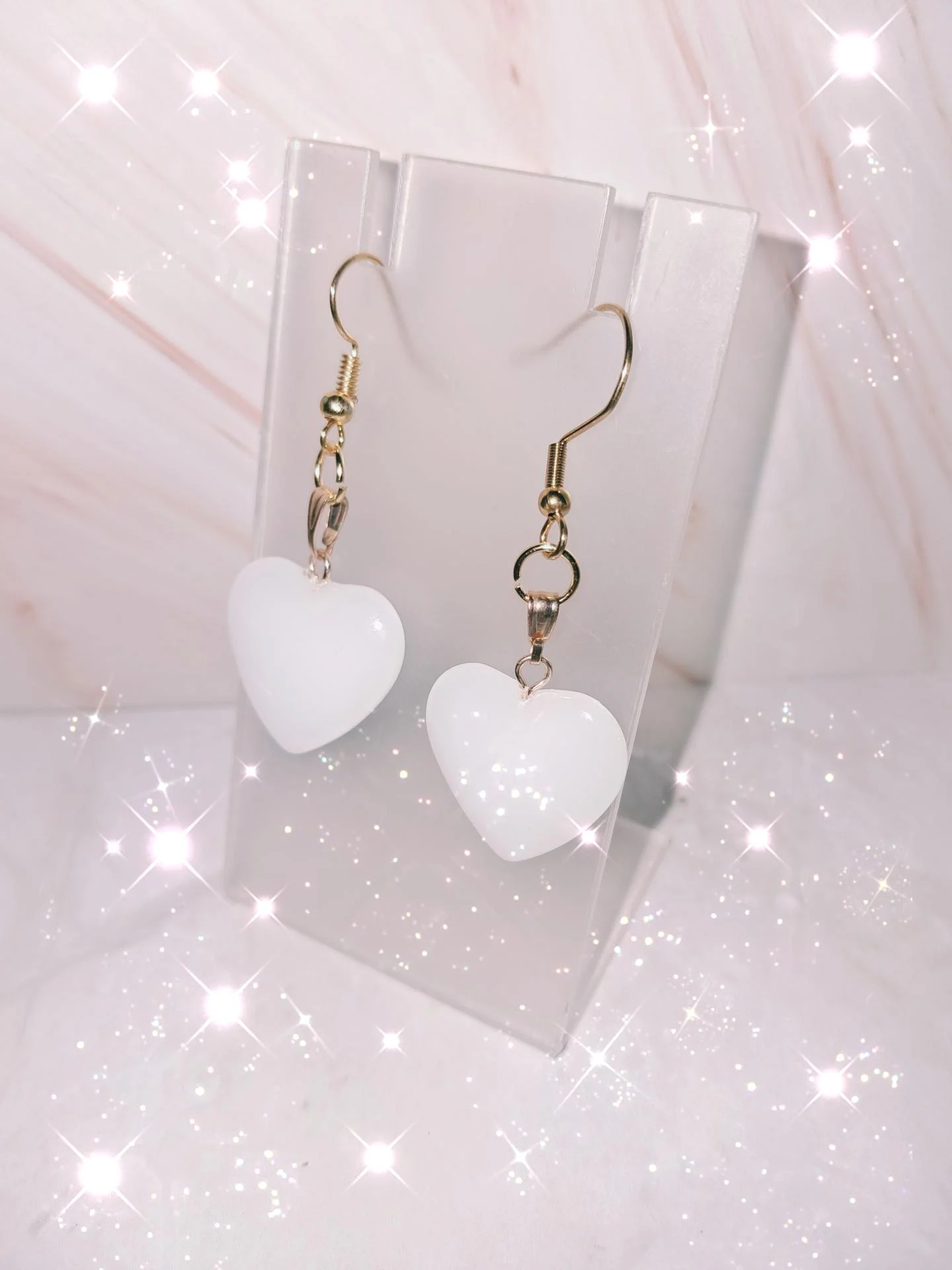 Boucles d'oreilles glamour avec ses coeurs blanc opaque en verre,structure en acier inoxydable dorée.
