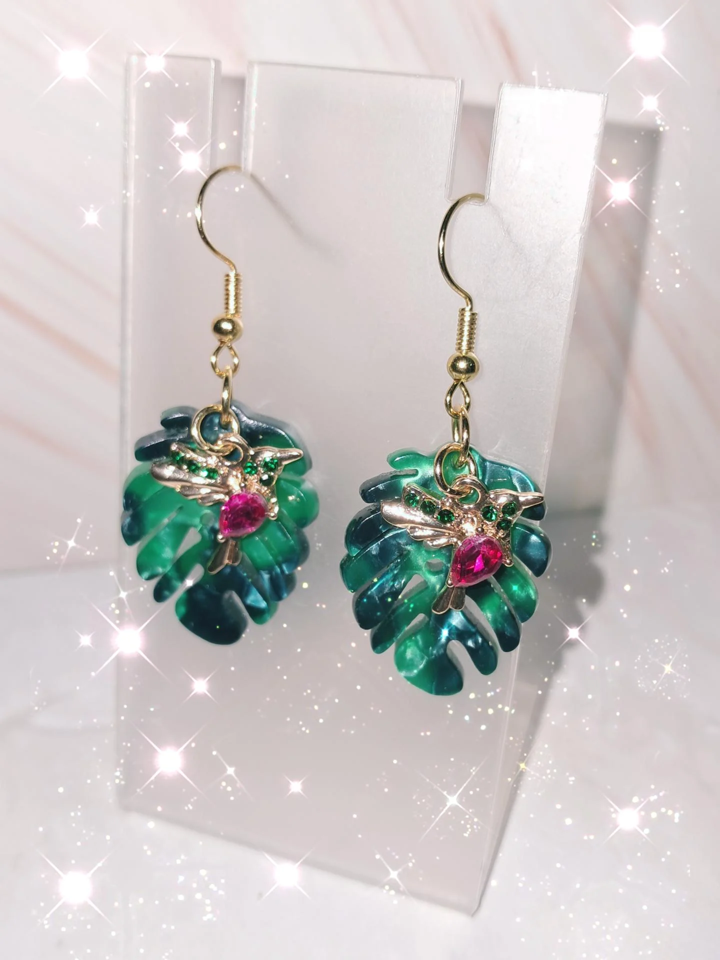 Boucles d'oreilles feuilles vertes en acrylique,sublimées par un délicat colibri doré et rose.Une création lumineuse et poétique ,symn bole de liberté de joie et de renouveau.