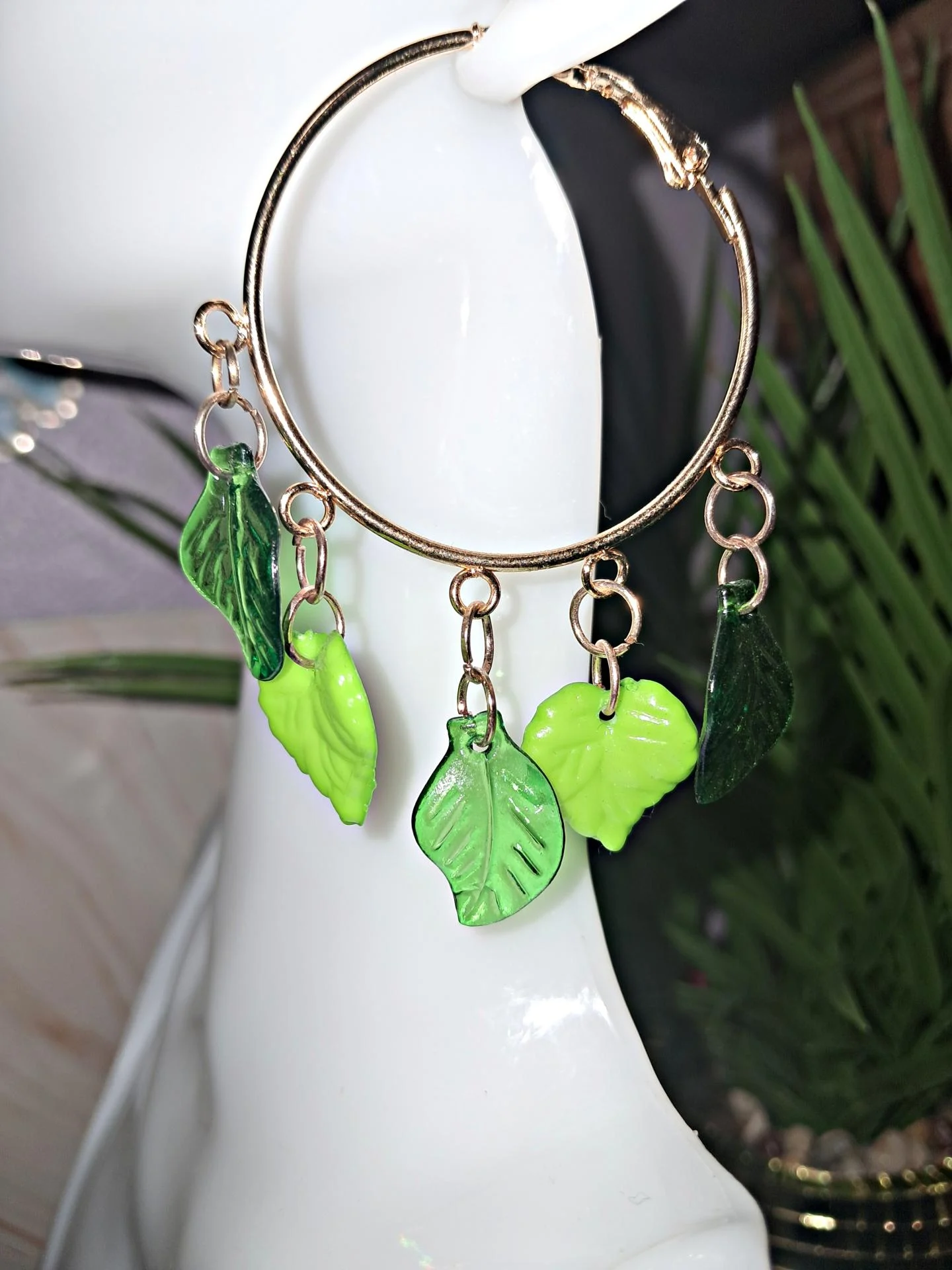 Boucles d'oreilles créoles dorées feuilles vertes en acrylique