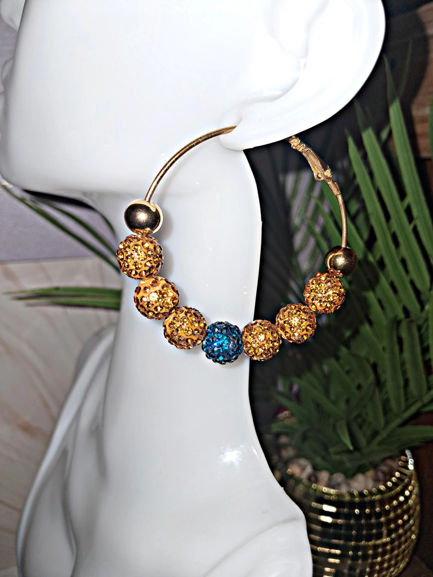 Créoles raffinées habillées de strass couleur cuivre ,sublimées par une perle centrale bleu canard et des finitions dorées. Un bijou chic et élégant.