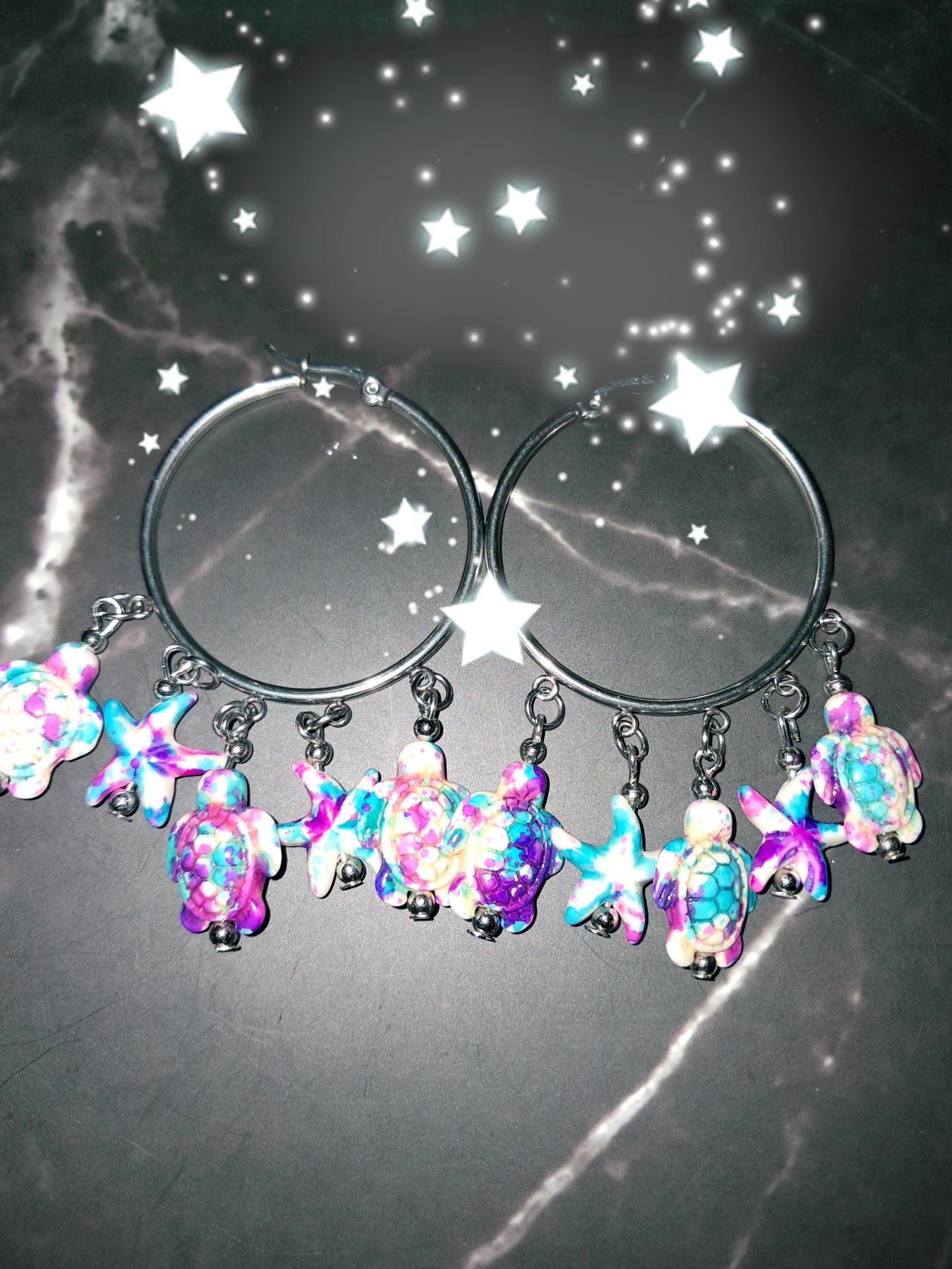Boucles d'oreilleS créoles aux motifs marin ,composé d'étoile de mer et tortue en pierre de synthèse bien coloré.
