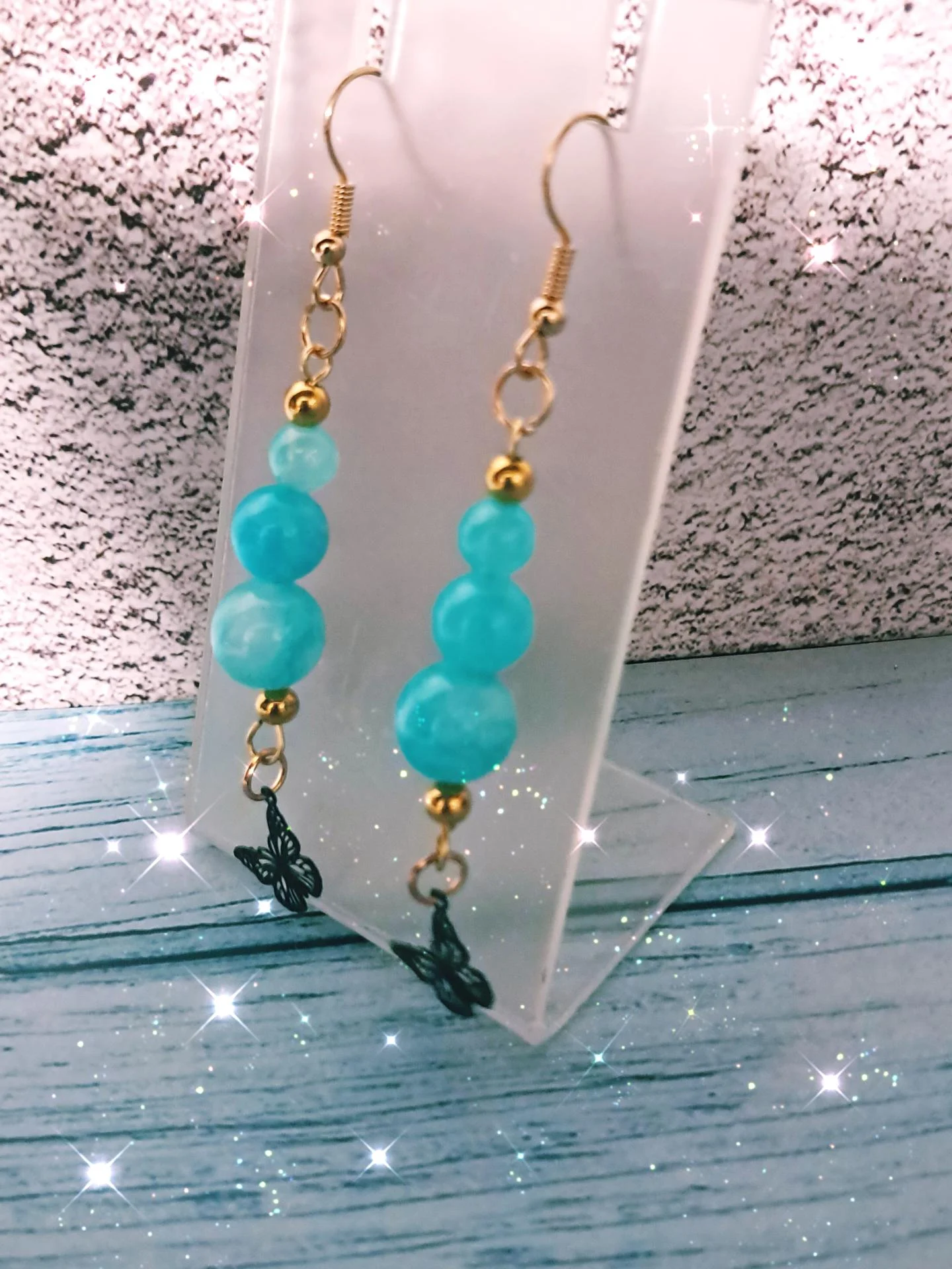 Elégantes boucles d'oreilles en acier inoxydable doré,ornées de perles d'agate bleue et d'un pendentif papillon noir.Un bijou raffiné qui allie douceur & caractère,parfait pour sublimer vos tenues.