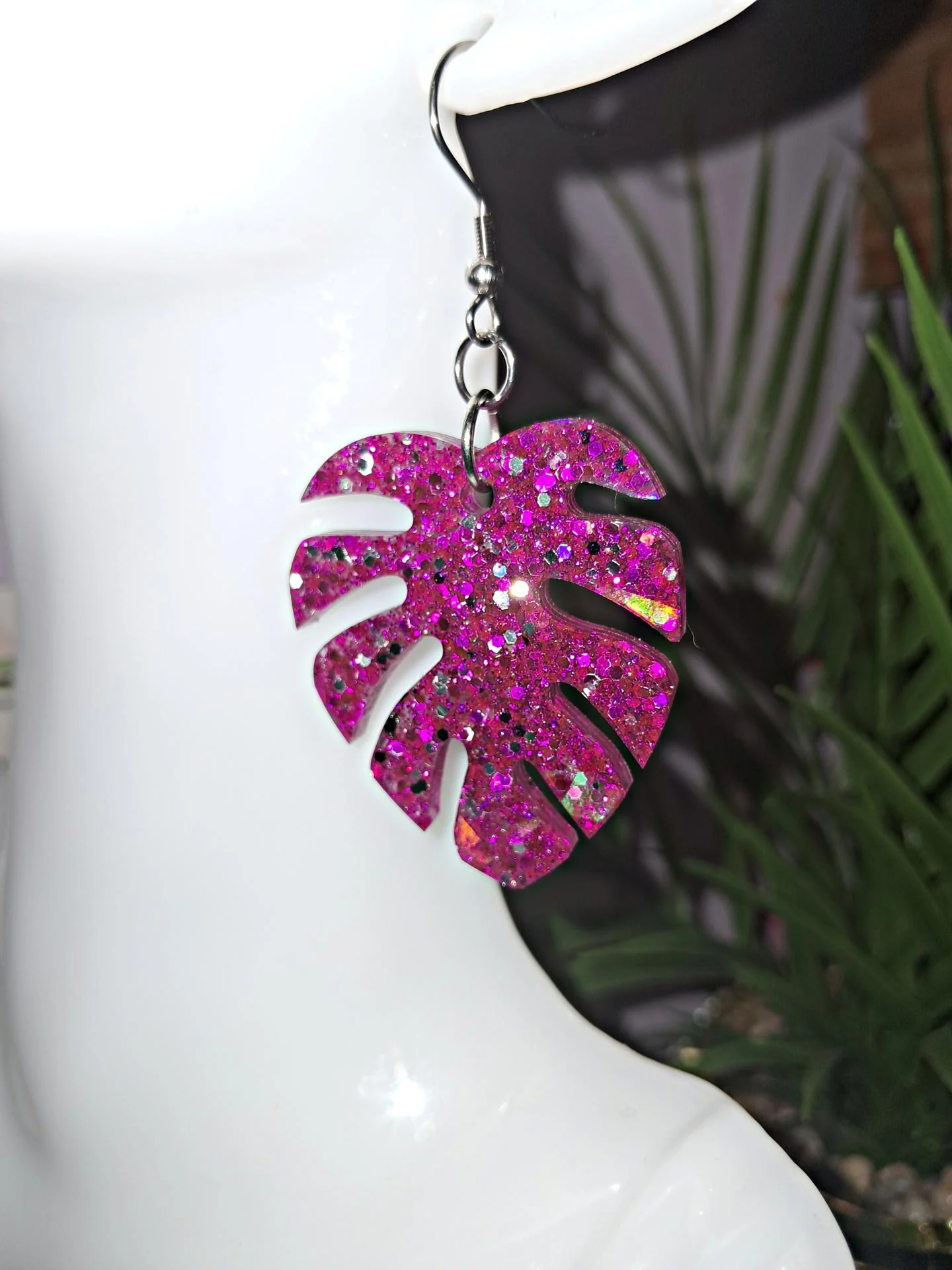 Boucles d'oreilles en forme de feuille rose pailleté.Un bijou féminin,lumineux,d'été et plein de charme.