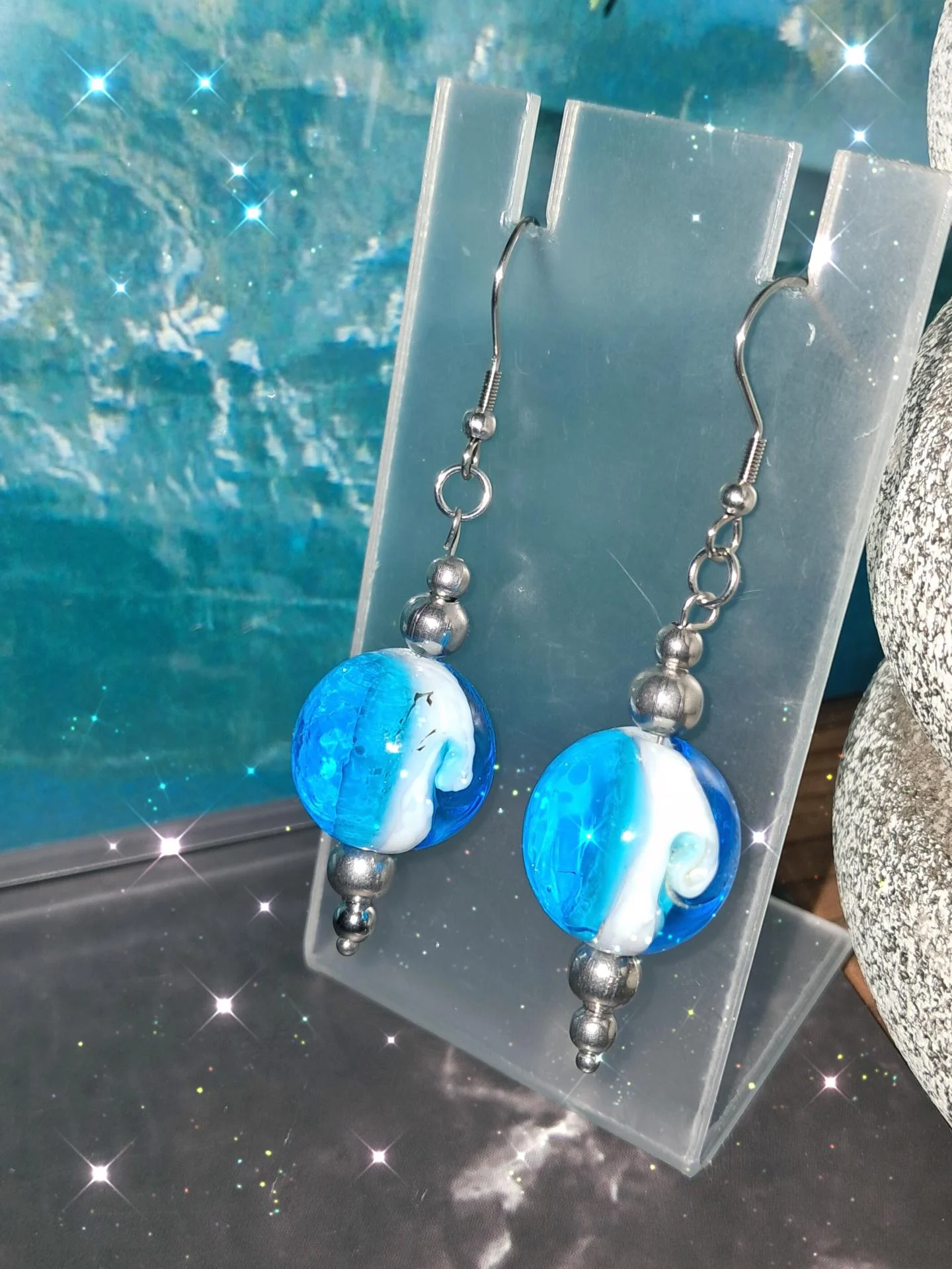 boucles d'oreilles bleues bijoux marbrés perles en verre bijoux océan bijoux artisanaux acier inoxydable