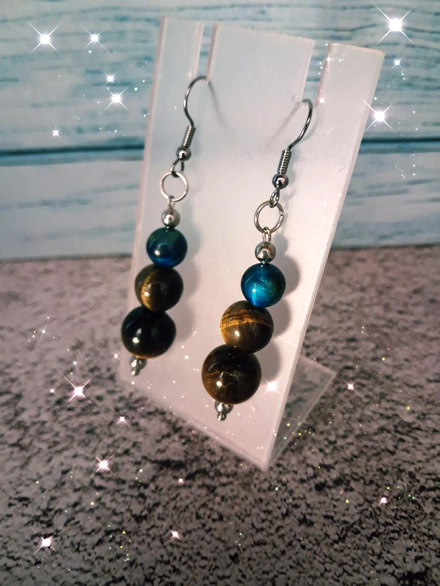 Boucles d'oreilles élégantes en pierres d'oeil de tigre marron et bleu,monté sur acier inoxydable.Une création unique qui allie énergie et protection naturelle.