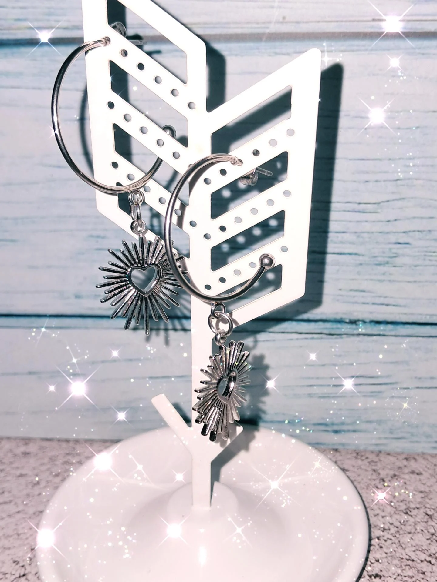 Boucles d'oreilles semi-créoles en acier inoxydable,ornées d'un motif soleil. Elégantes et lumineuses,elles capturent la chaleur et la positivité du soleil dans un design intemporel.