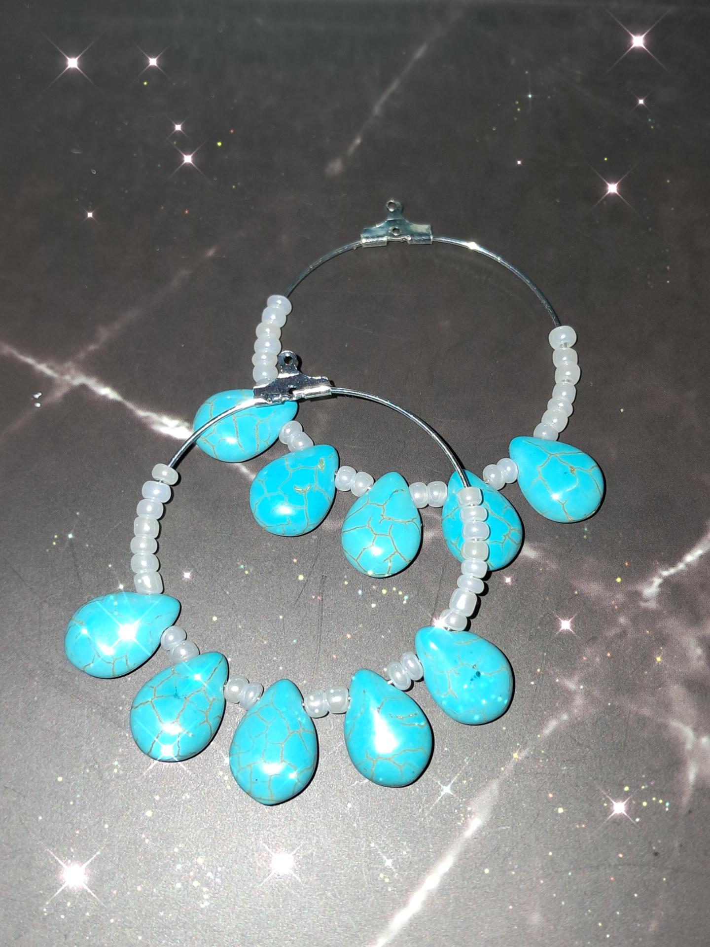 Des créoles légères et raffinées ,ou le blanc nacré danse avec les larmes turquoise.Un bijou élégant qui sublime chaque regard.