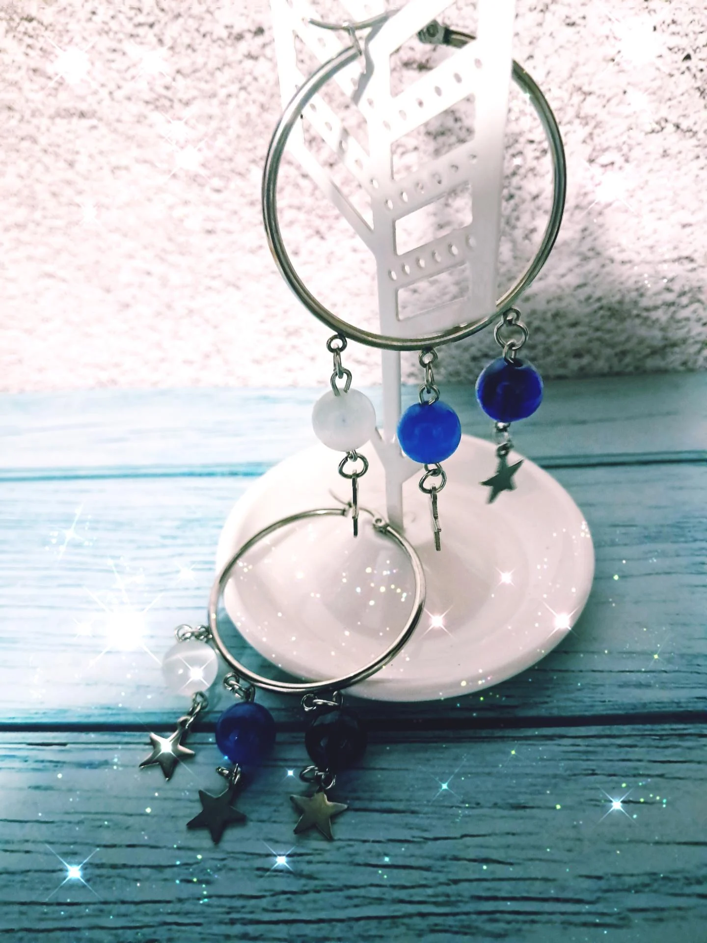 Créoles inox avec pendentifs en verre bleu et blanc-étoiles décoratives