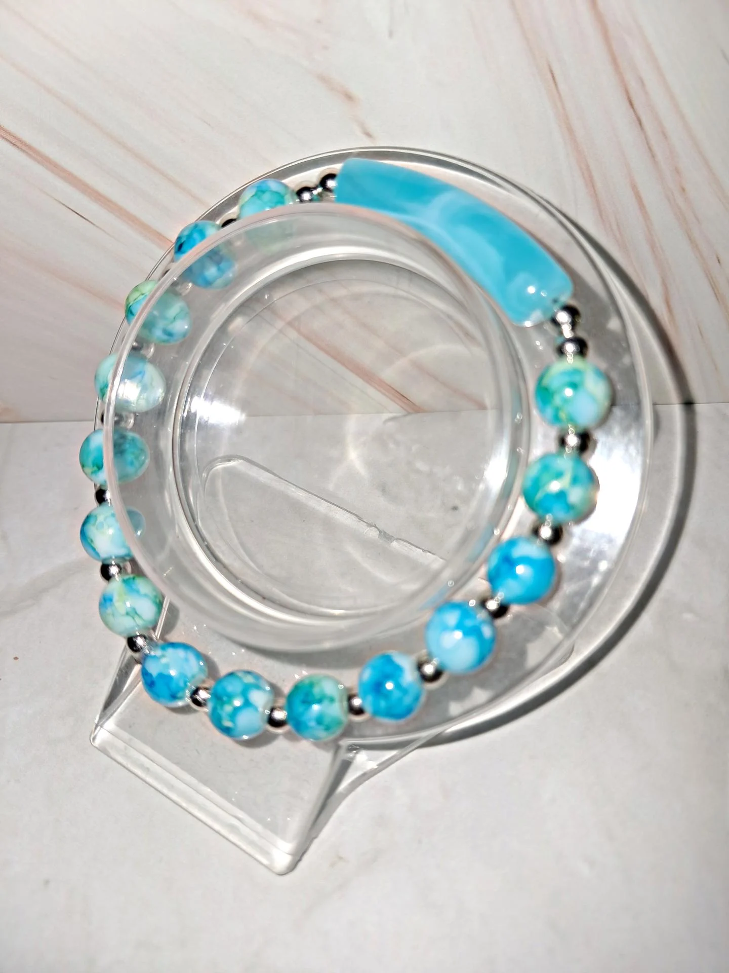 Bracelet tendance,extensible ,aux jolies couleurs bleu ciel marbré en verre,perles d'espacement argentées et cylindre en acrylique.