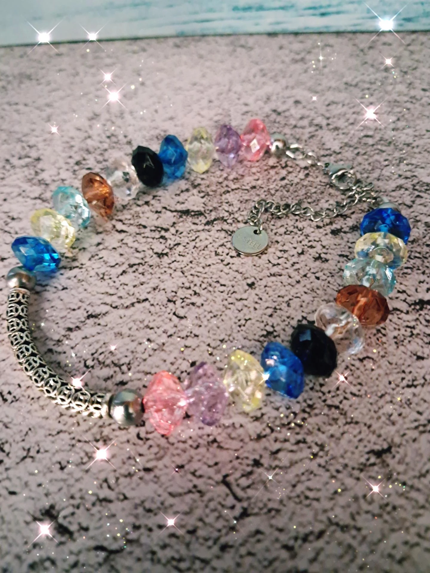 Bracelet réglable scintillant-perles facettées multicolores & tube argenté