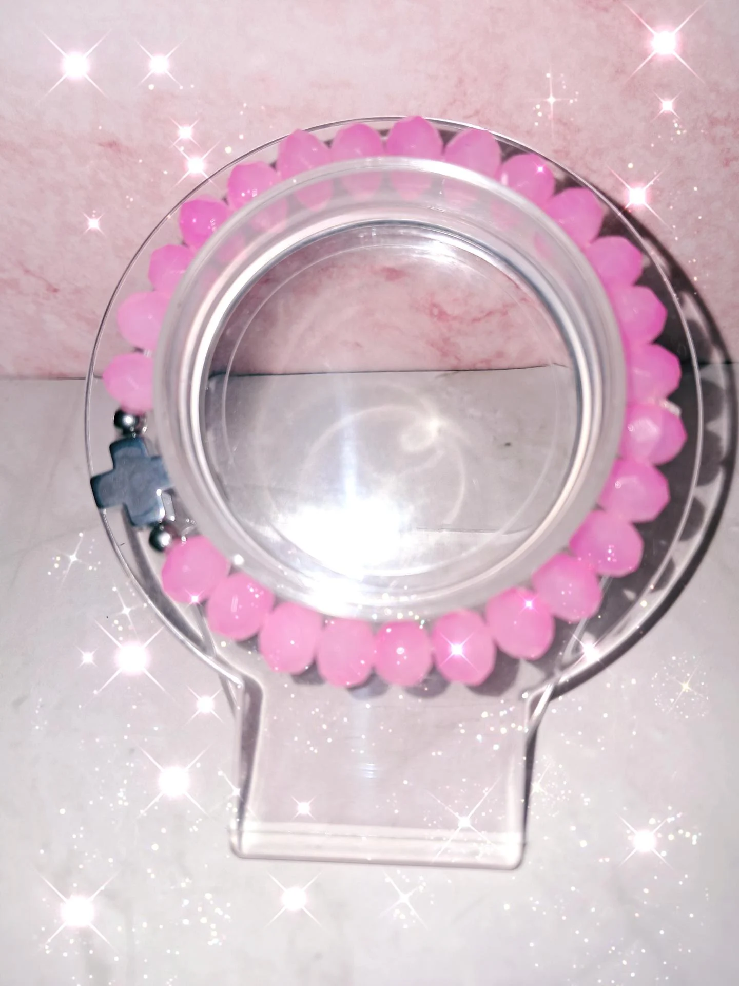 Bracelet extensible ,chic,sensuelle et moderne,avec une croix et deux petites perles en acier inoxydable,perles en verre facettées rose bubble gum