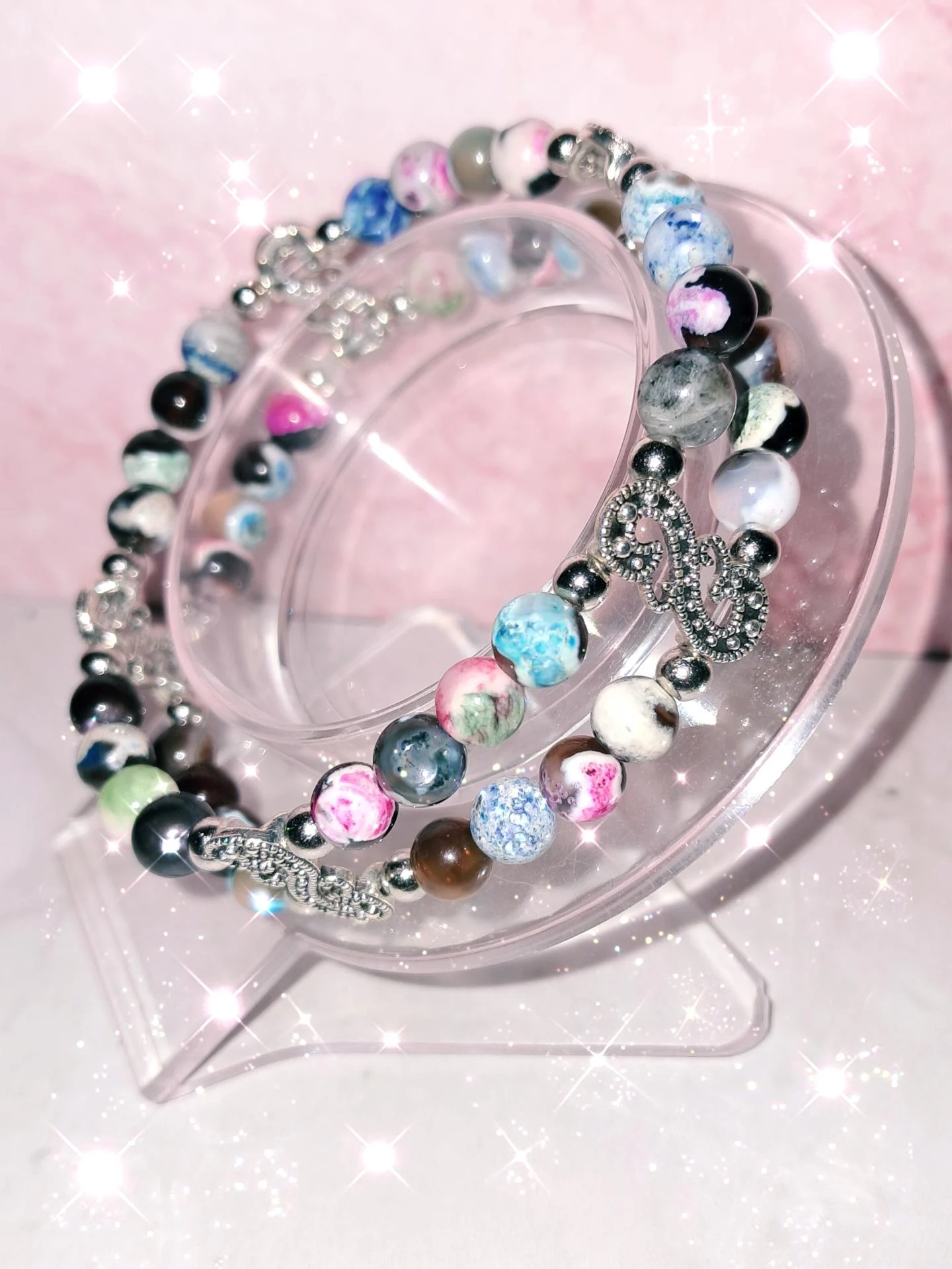 Un bracelet extensible, finement travaillé qui habille le poignet de couleurs vibrantes.Deux rangées de perles d'agate multicolore,associées à des perles et des éléments en acier inoxydable,formant un S un motif élégant et vibrant.