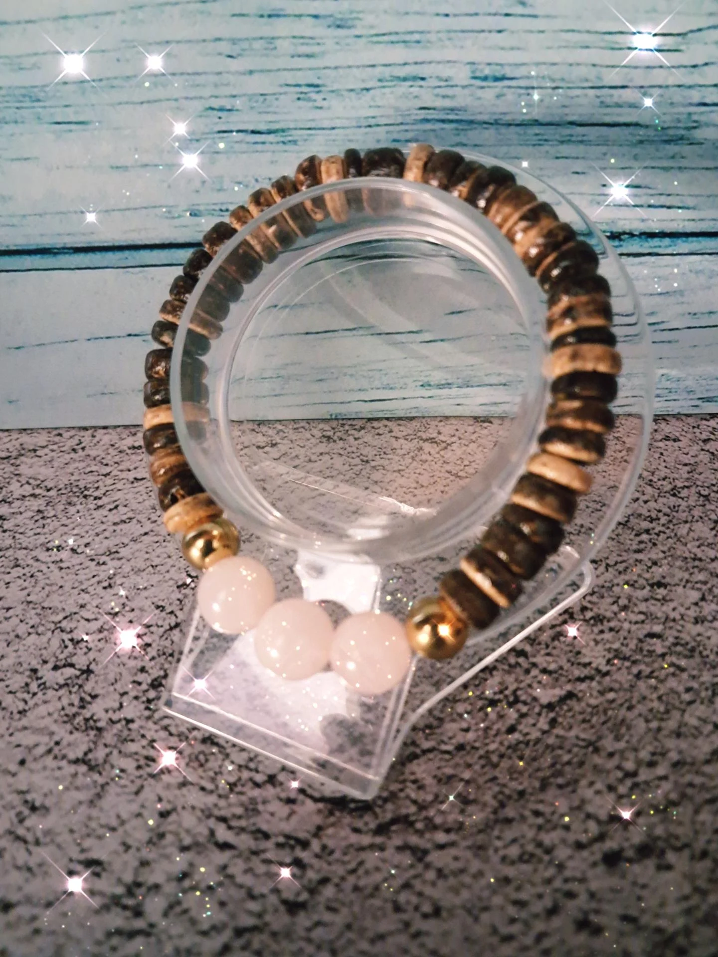 Bracelet extensible en bois de coco verni, acier inoxydable & quartz rose