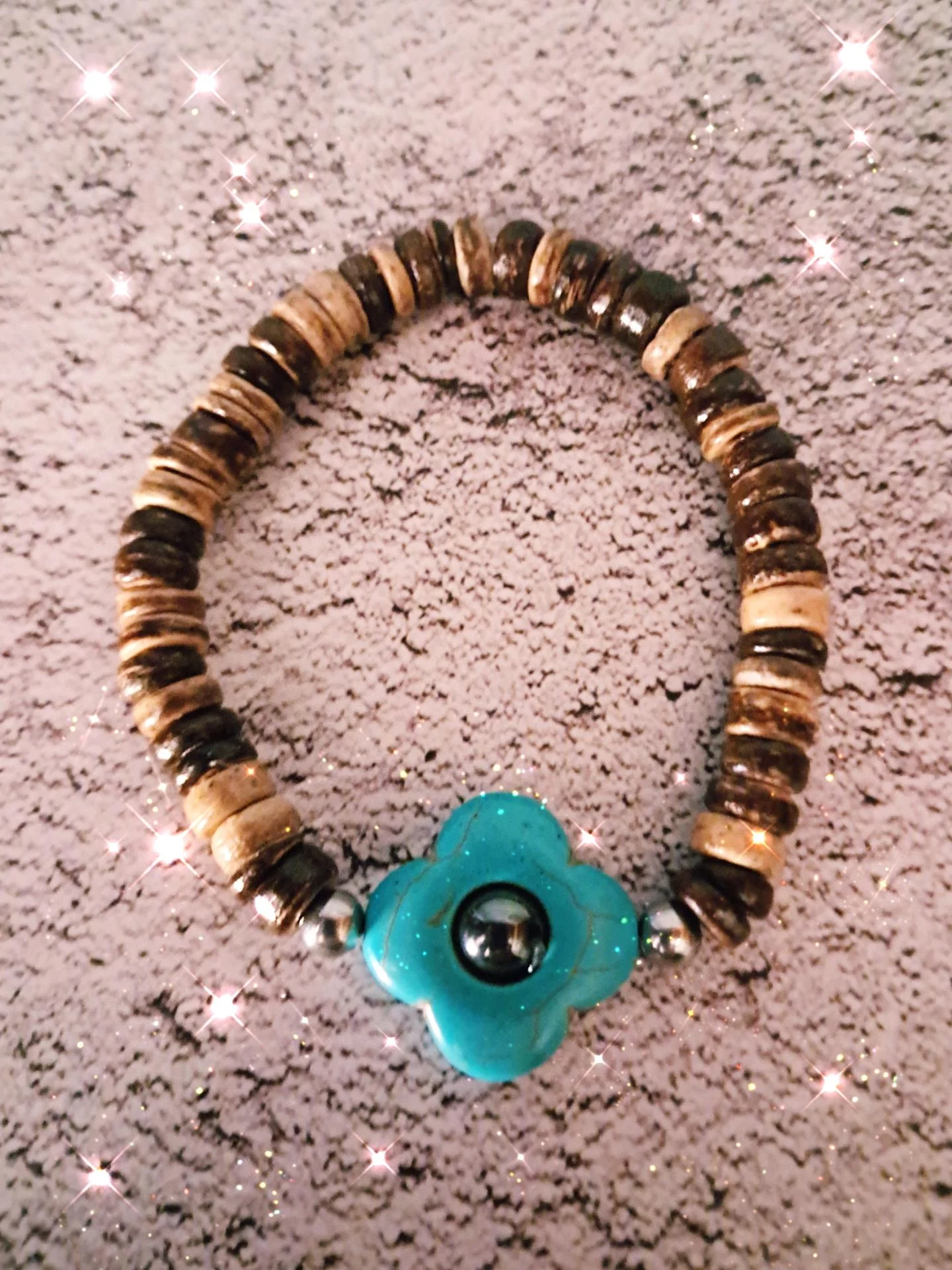 Bracelet extensible en bois de coco vernis avec fleur en pierre de turquoise ,au centre une perle en pierre d'hématite noire, accompagné de deux perles en acier inoxydable