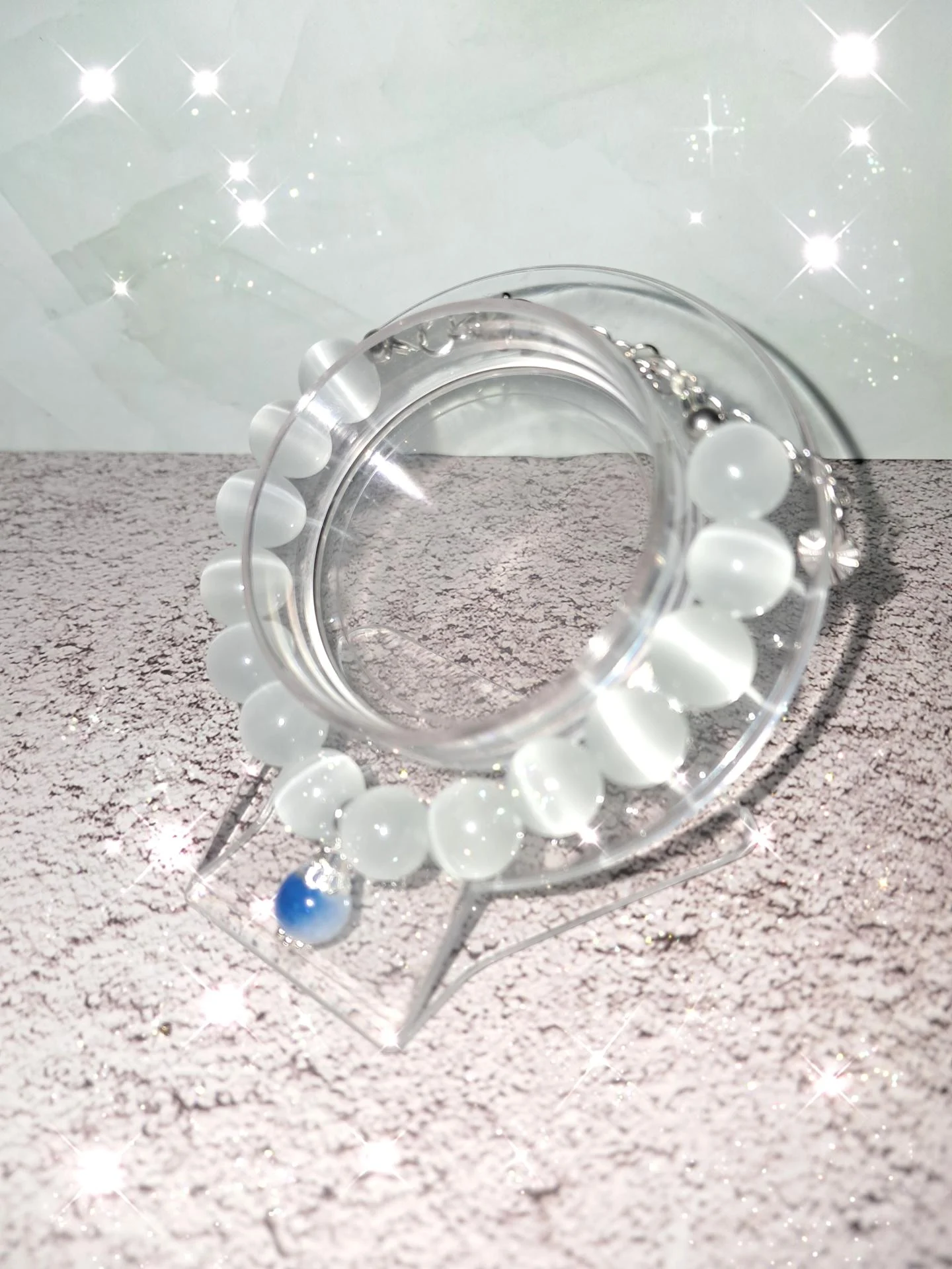 Sublime bracelet réglable chaine argenté en acier inoxydable,orné de grosses perles de 12 mm d'oeil de chat blanc.Et petit pendentif bleu et blanc pour sublimer le bracelet.