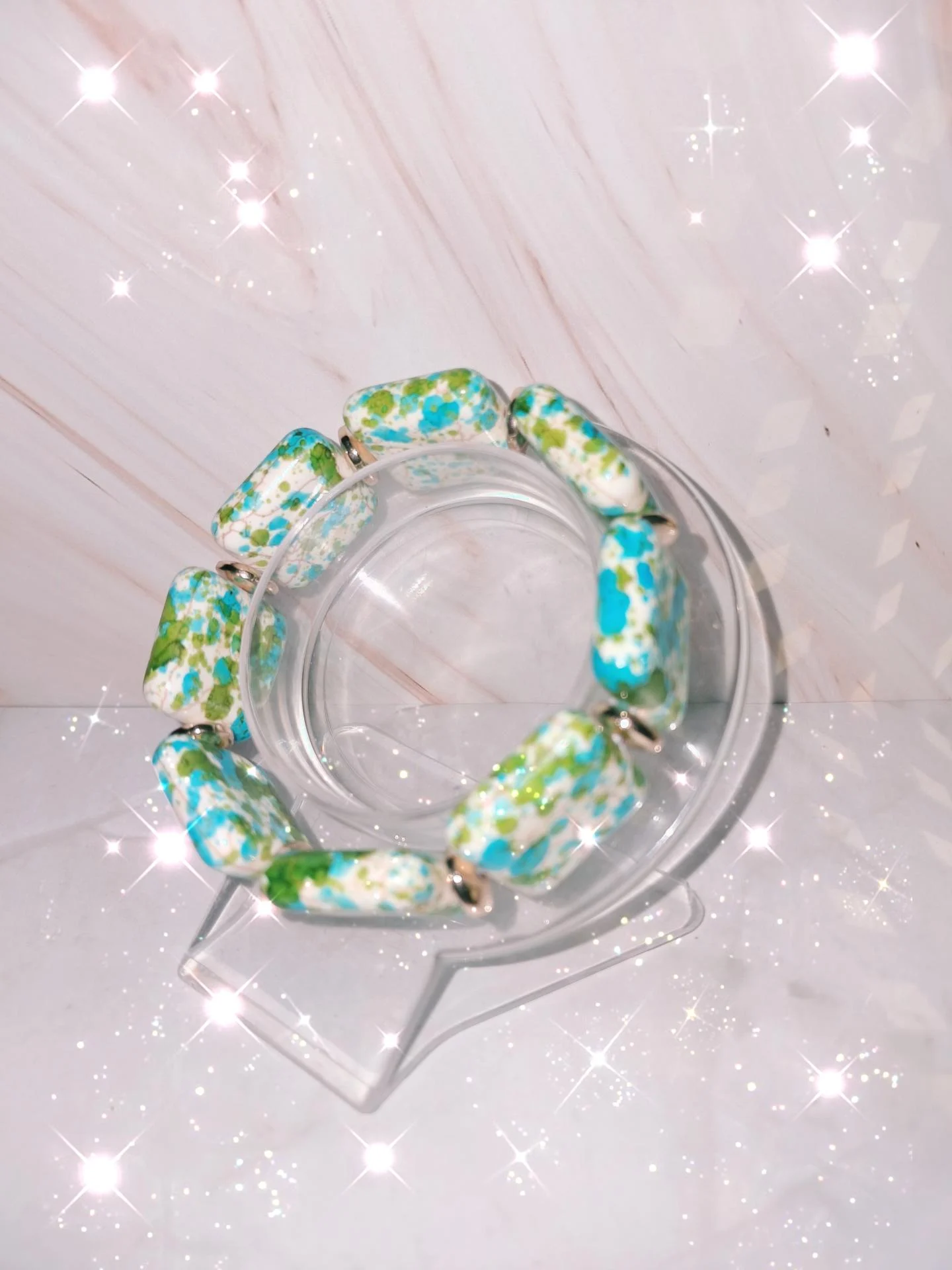 Bracelet extensible en pierre ,tacheté aux couleurs printanière ,bleu vert blanc et perles d'intercalaires plates dorées en hématite.