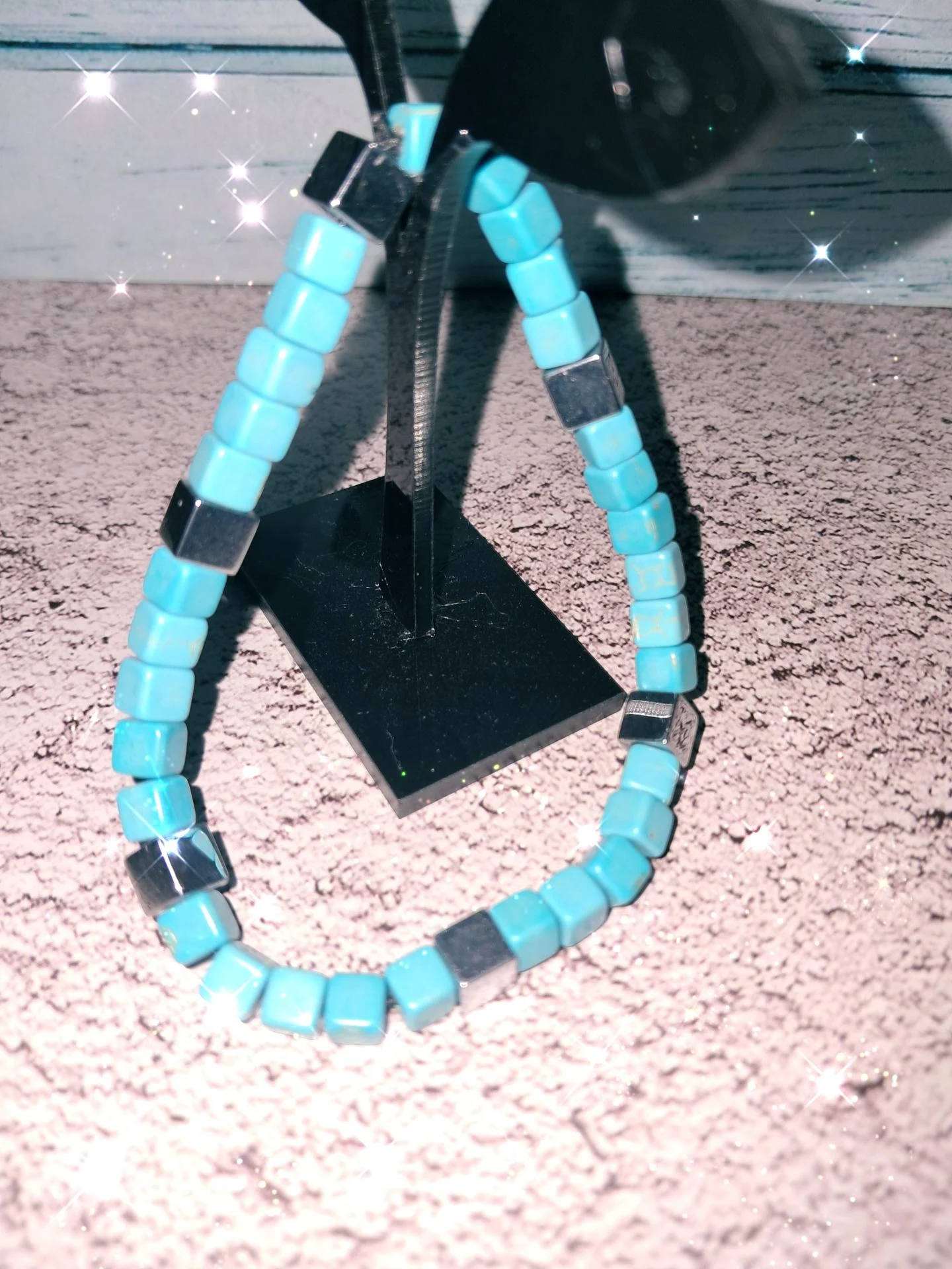 Bracelet masculin en pierres naturelles de turquoise & d'hématite carrées,monté sur fil extensible résistant.Un bijou élégant et énergisant,symbole d'équilibre & la force intérieure.