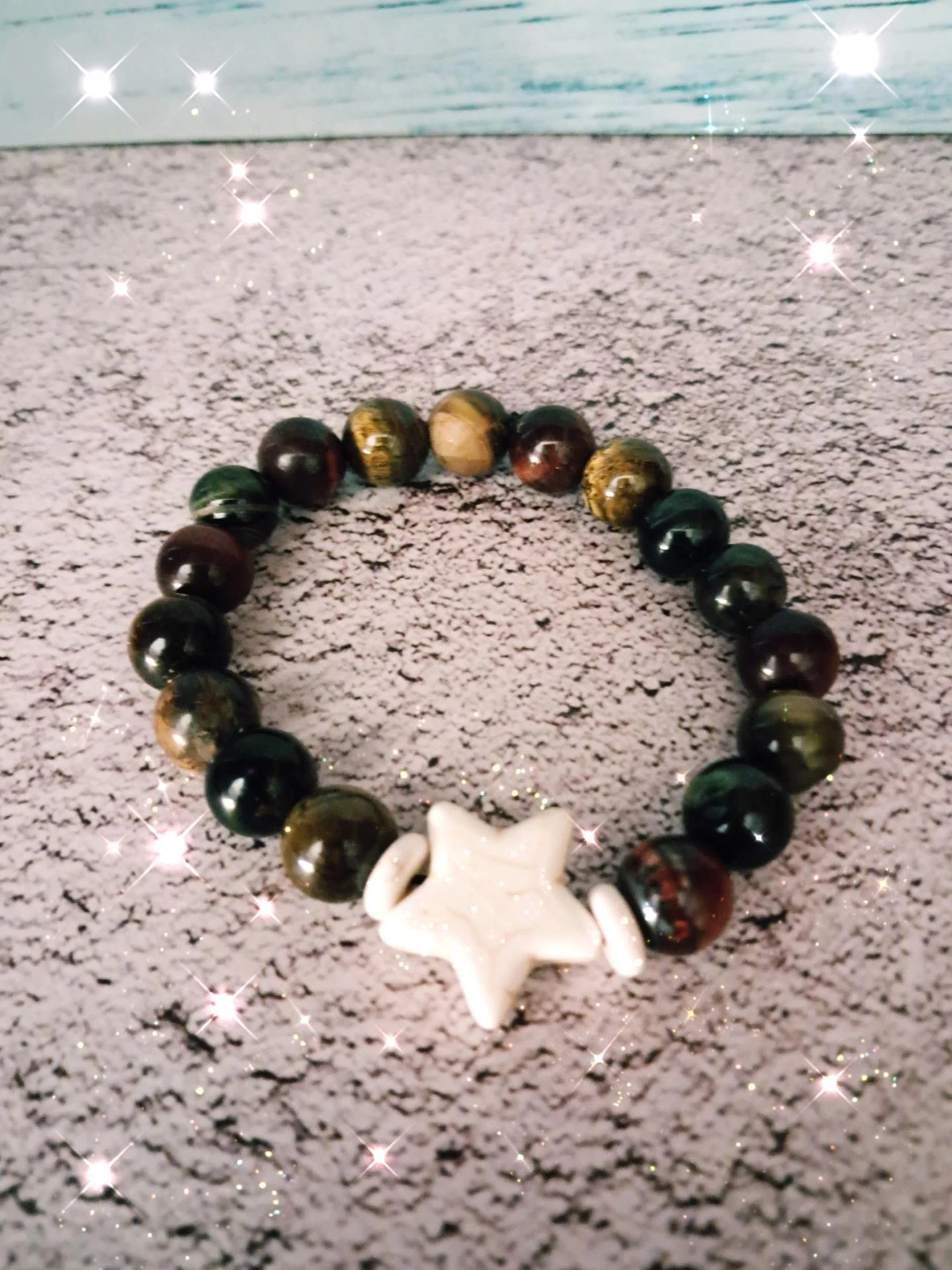 Un bracelet élégant en perles d'oeil de tigre naturel,rehaussé d'une étoile en howlite blanche,symbole d'équilibre et de protection.Idéal pour attirer confiance & apaisement au quotidien.