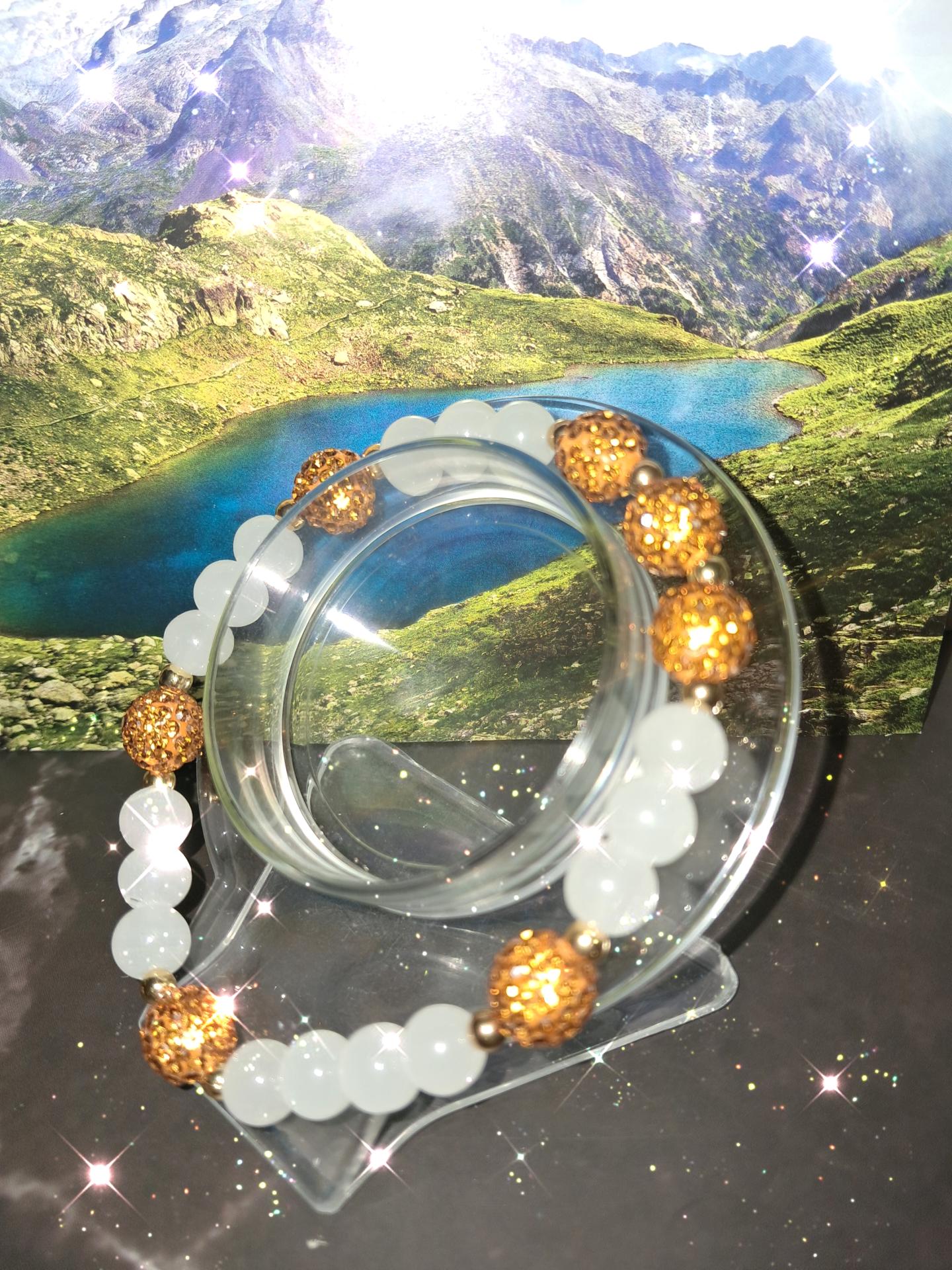 Bracelet extensible,perles en verre blanc opaque accompagné de petites perles en acier inoxydable dorées et de perles en strass de couleur miel. Bracelet scintillant ,chic, intemporel ,et élégant.
