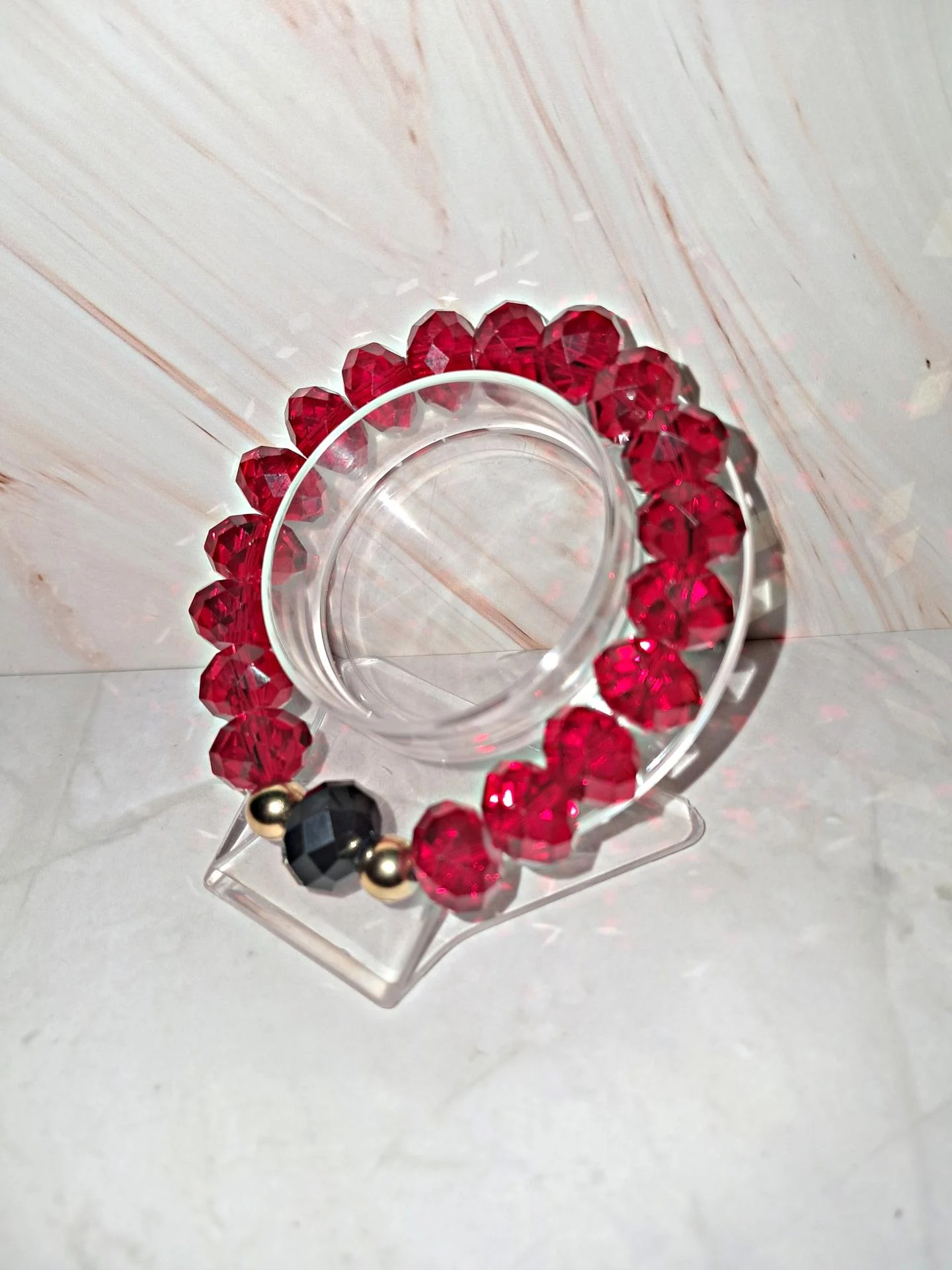 Bracelet éclatant en perles de verre rouge transparent vif a facettes,sublimé par une perle centrale noire et touches dorées. Un bijou chic et lumineux.