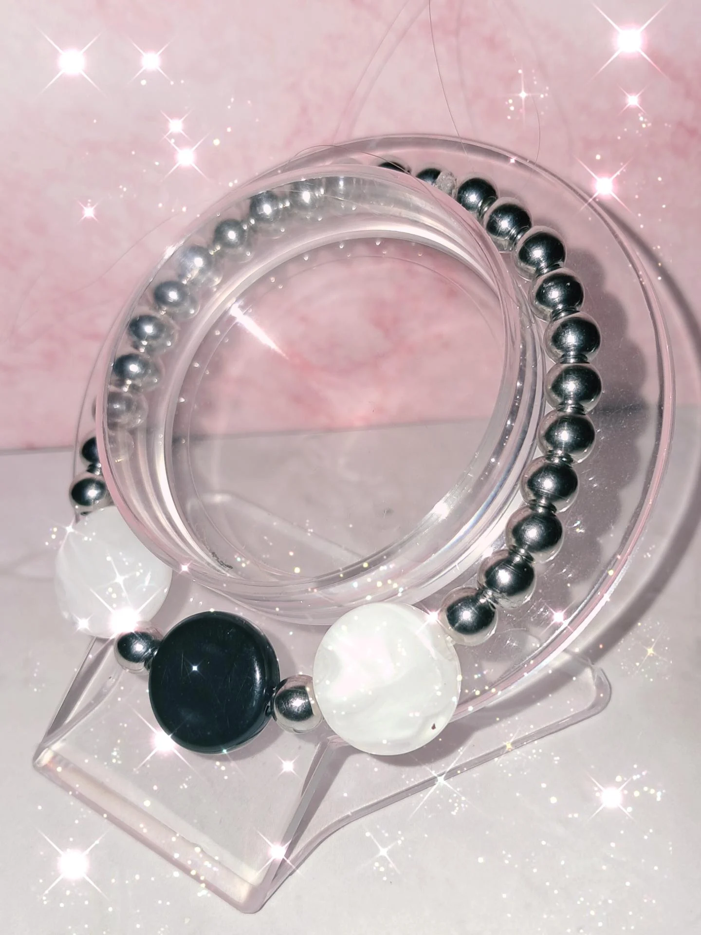 Bracelet extensible argenté-perle en acier ynoxydable & pastilles acrylique blanc/noire