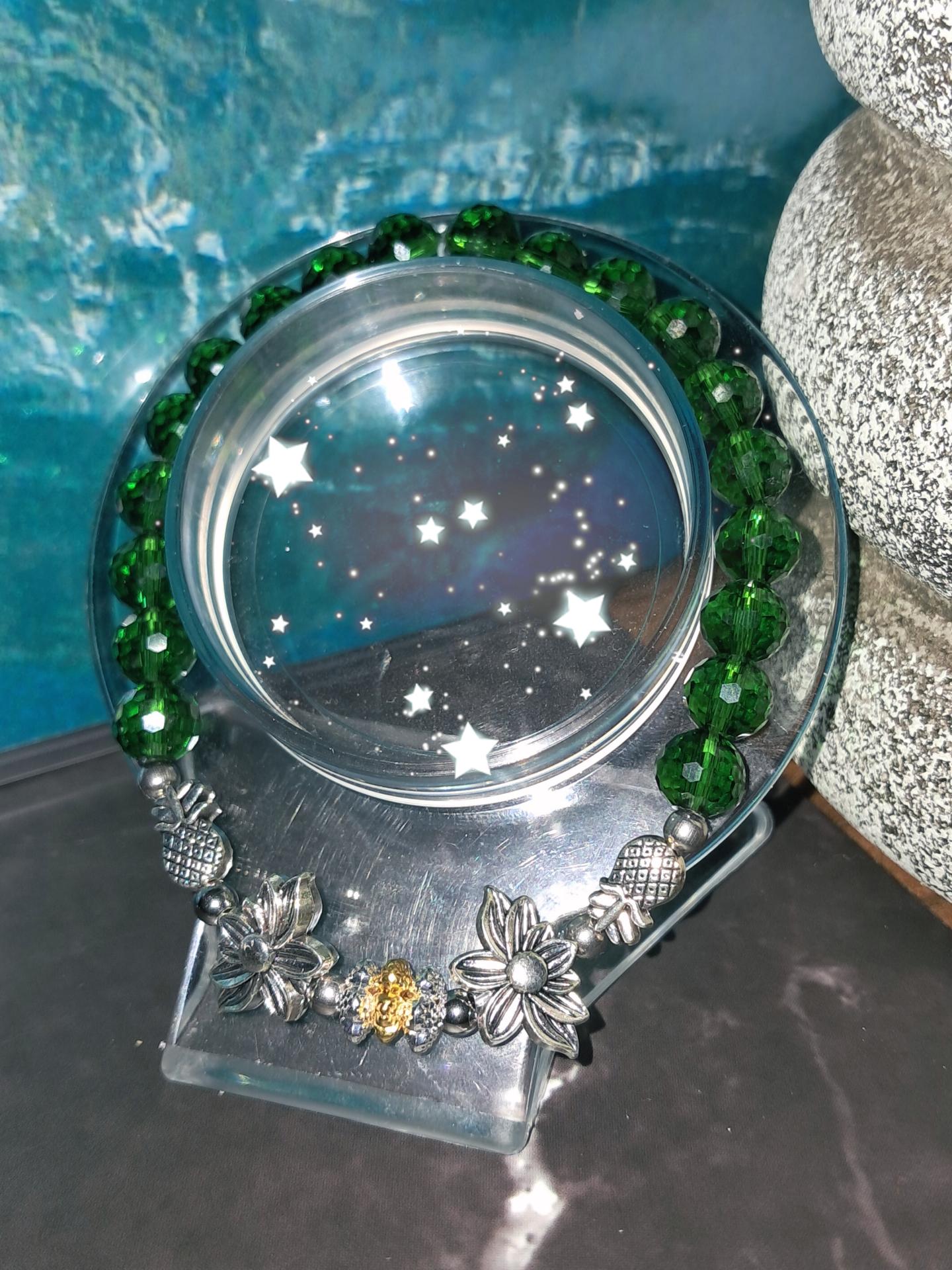 Bracelet artisanal en perles de verre facetté couleur émeraude,agrémenté de motifs lotus et ananas en alliage de zinc,petites perles rondes en acier inoxydable argenté,dont une de couleur or en acier inox. Une pièce chic,fraîche et pleine de sens,idéale pour sublimer une tenue ou offrir un symbole de renouveau.