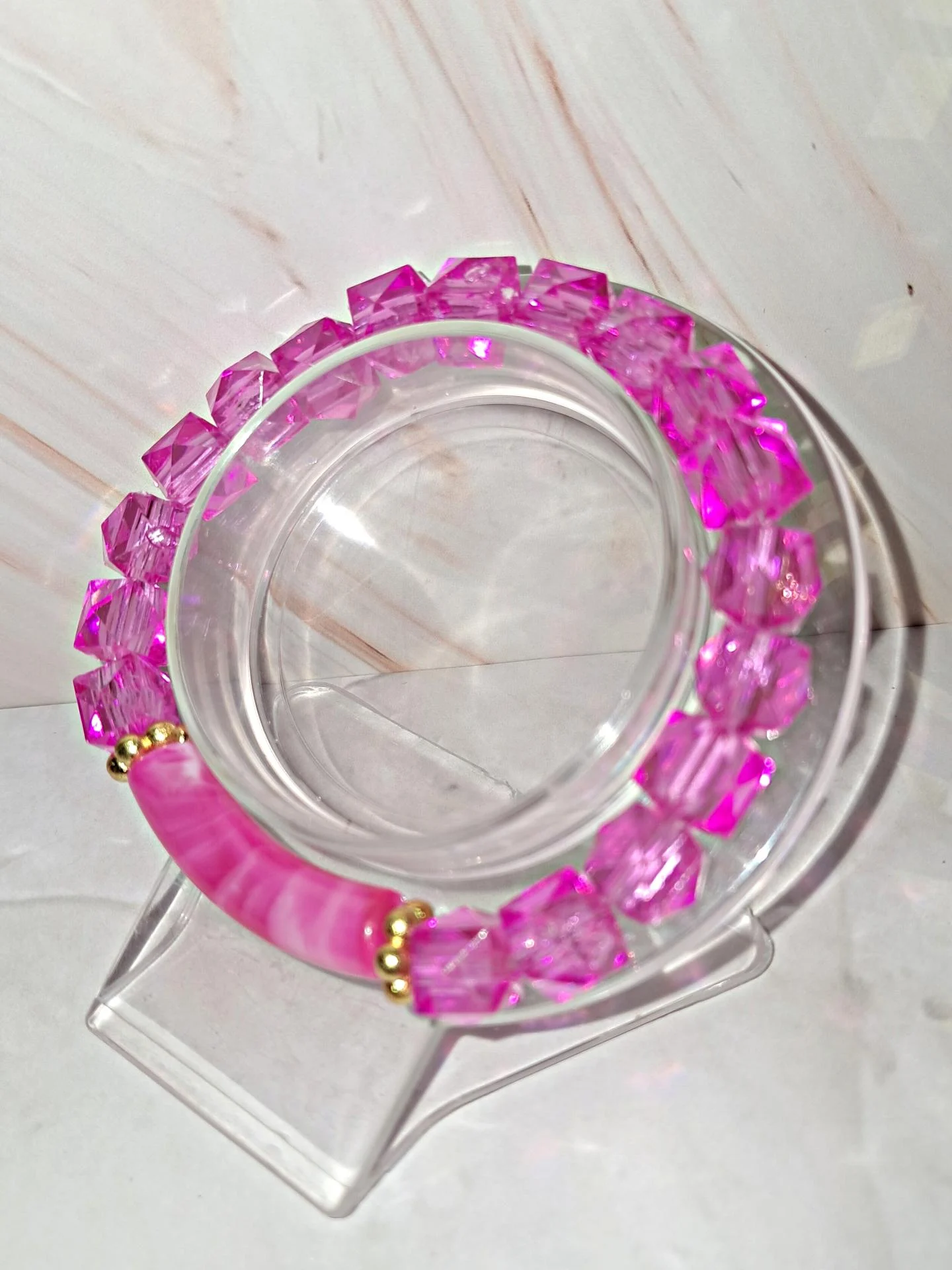 Bracelet délicat en perles carrées à facettes rose vif transparent,sublimé par un cylindre central marbré et des touches dorées. Un bijou féminin et lumineux.