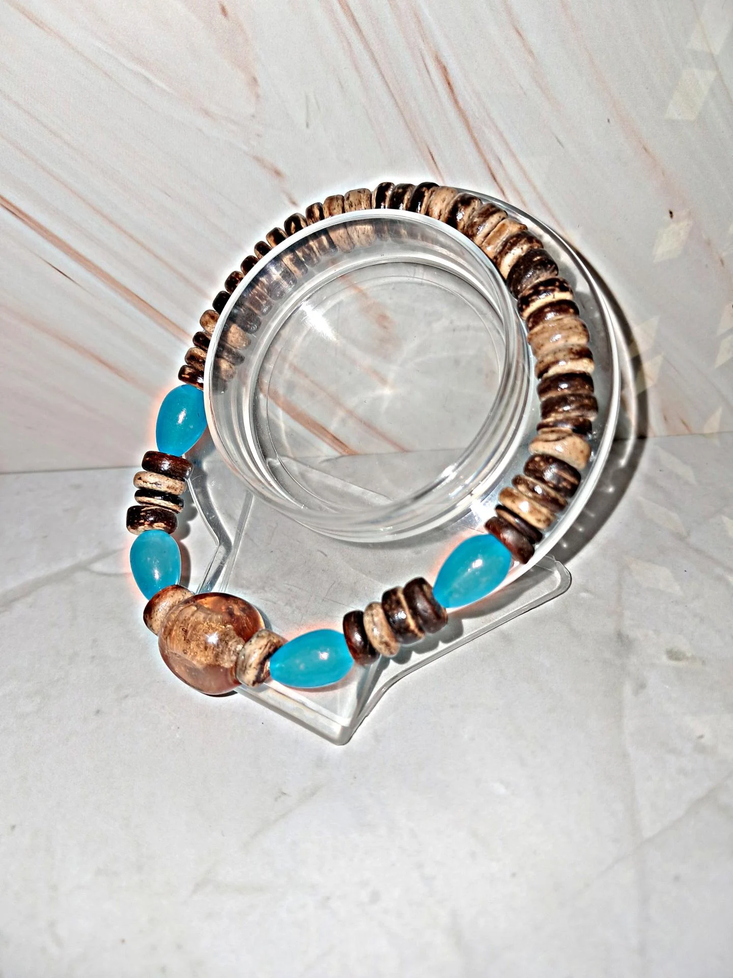 Bracelet artisanal en perles de coco vernis,rehaussé de touches bleu ciel et d'une perle centrale au reflets feu orangé. Un bijou chaleureux et unique.