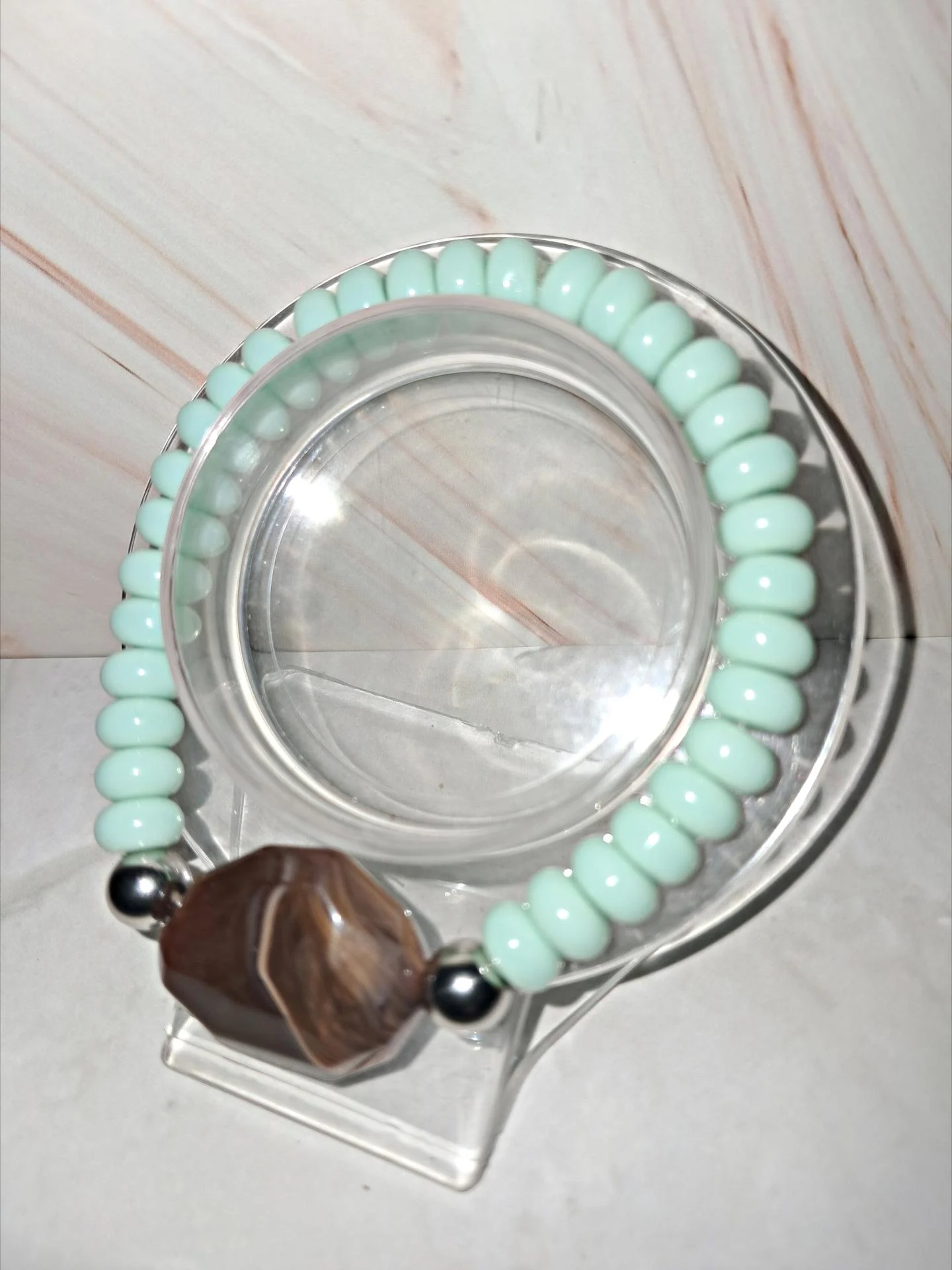 Bracelet lumineux en perles de verre vert d'eau sublimé par deux perles en acier inoxydable argenté,perle centrale marron marbré de forme irrégulière en acrylique.