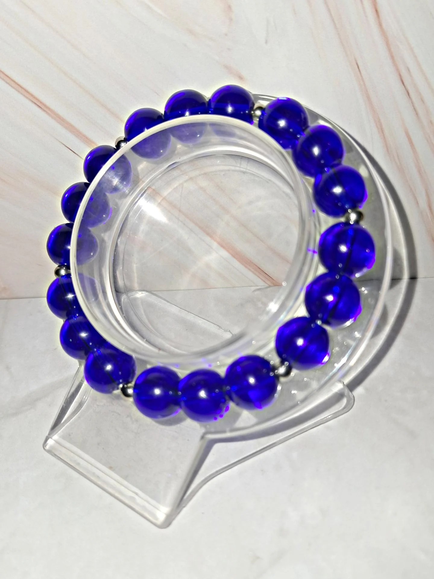 Beau bracelet extensible ,composé de perles en verre bleu roi et de séparateurs en acier inoxydable argenté. Confortable et facile à enfiler.