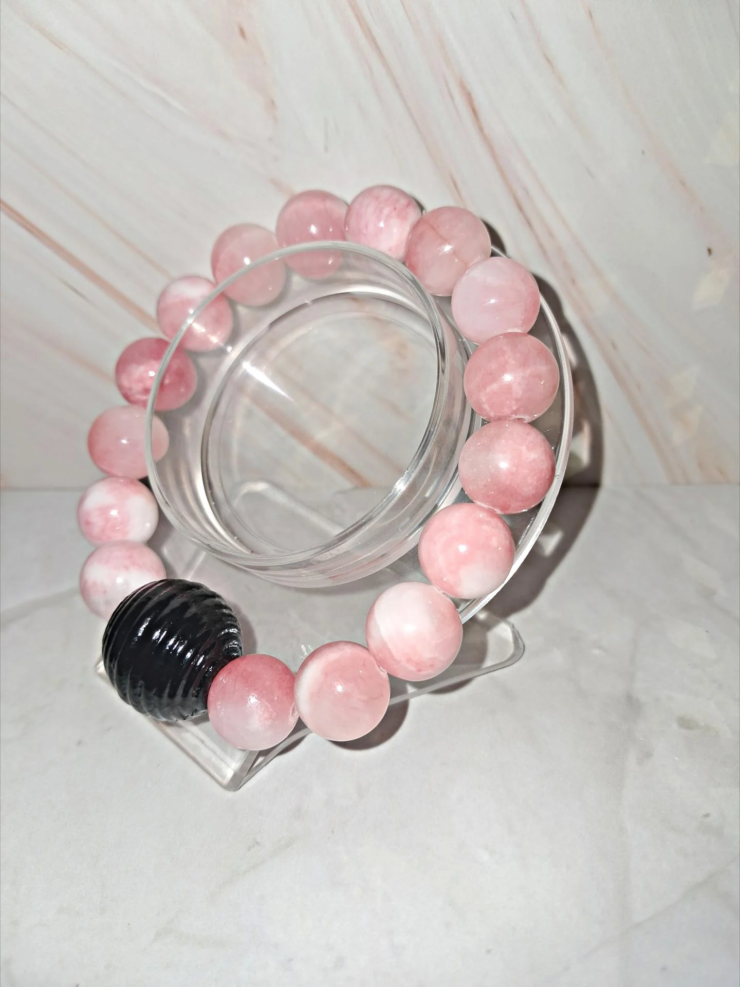 Bracelet raffiné en perles d'imitation Jade rose marbré de blanc,sublimé par une grosse perle centrale noire vernis.Un bijou à la fois doux et audacieux.