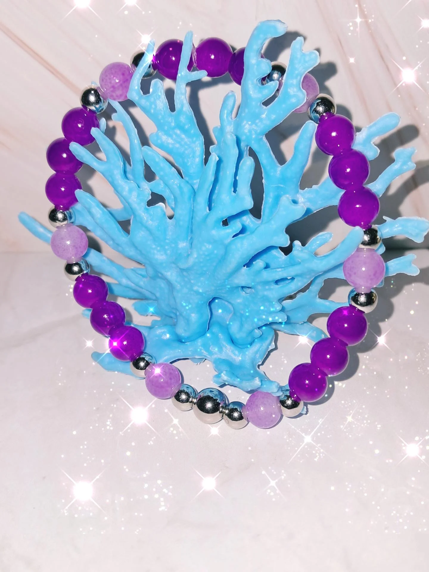 Bracelet extensible lumineux avec des perles violettes et mauves,ponctué de perles d'espacement en acier inoxydable argenté. Elégant ,vif et facile à porter ,parfait pour illuminer vos tenues !!!