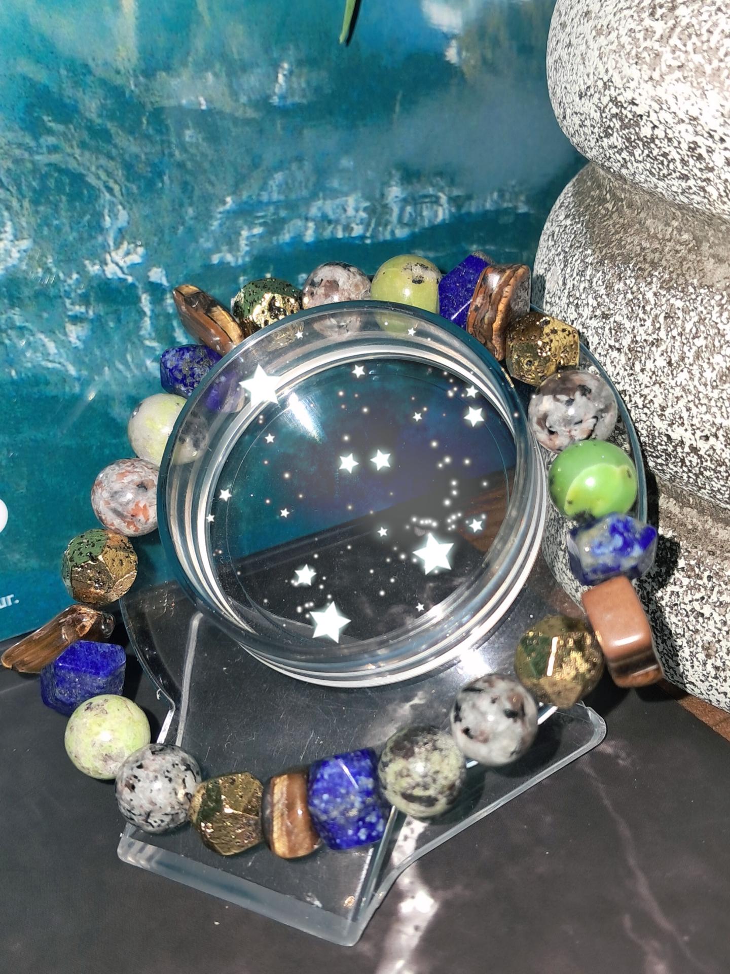 Bracelet fait main,composé de pierres naturelles soigneusement choisies : Lapis-lazuli ,Hématite doré ,Pierre de lave de feu ,oeil de tigre ,Chrysoprase australienne. Bracelet extensible ,solide et confortable ,alliant énergie ,protection et élégance. Une création unique née de mon intuition de l'amour des pierres et des couleurs.