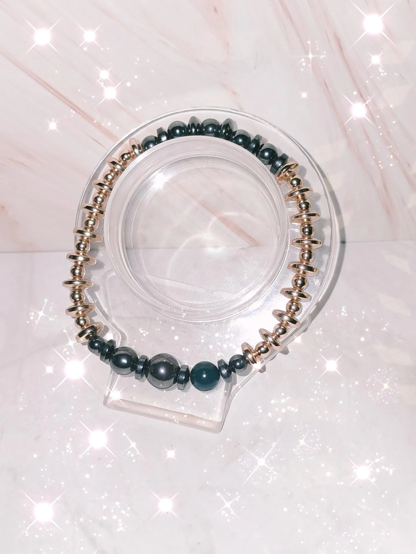 Bracelet extensible homme,,composé de perles en hématite noire et dorée ,perles plates et rondes. Perles centrales plus grosses en hématite noire ce qui fait tout son charme.
