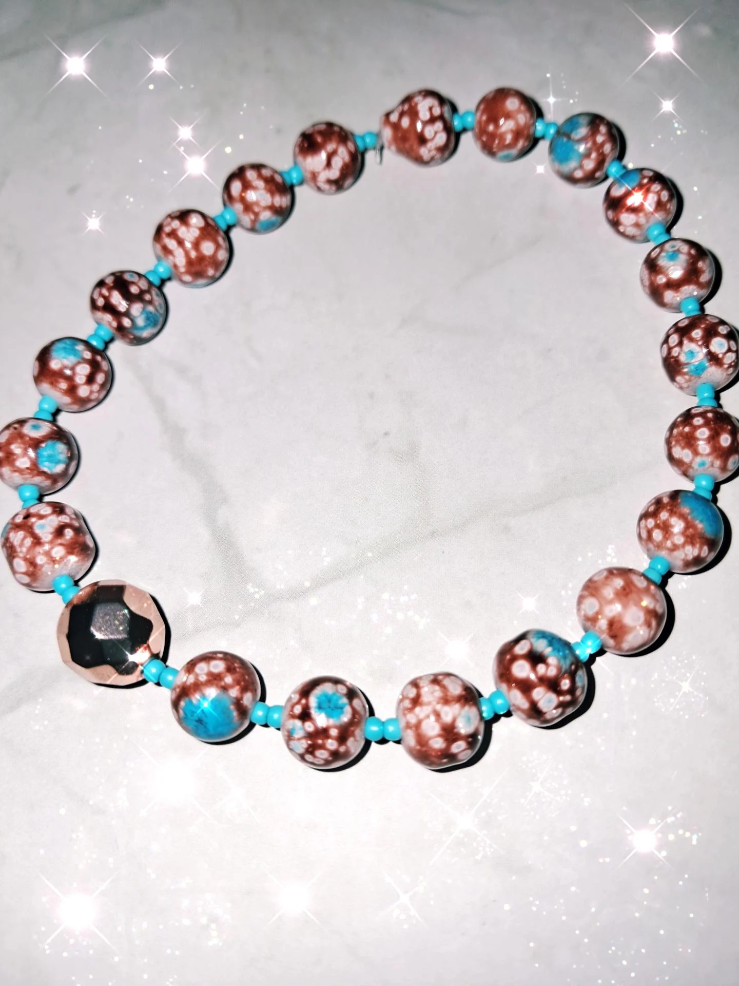 Bracelet large en perles de verre tachetées marron,blanc et bleu, avec des toutes petites perles de rocaille en couleur turquoise,avec une perle centrale facettée en hématite rose pale.