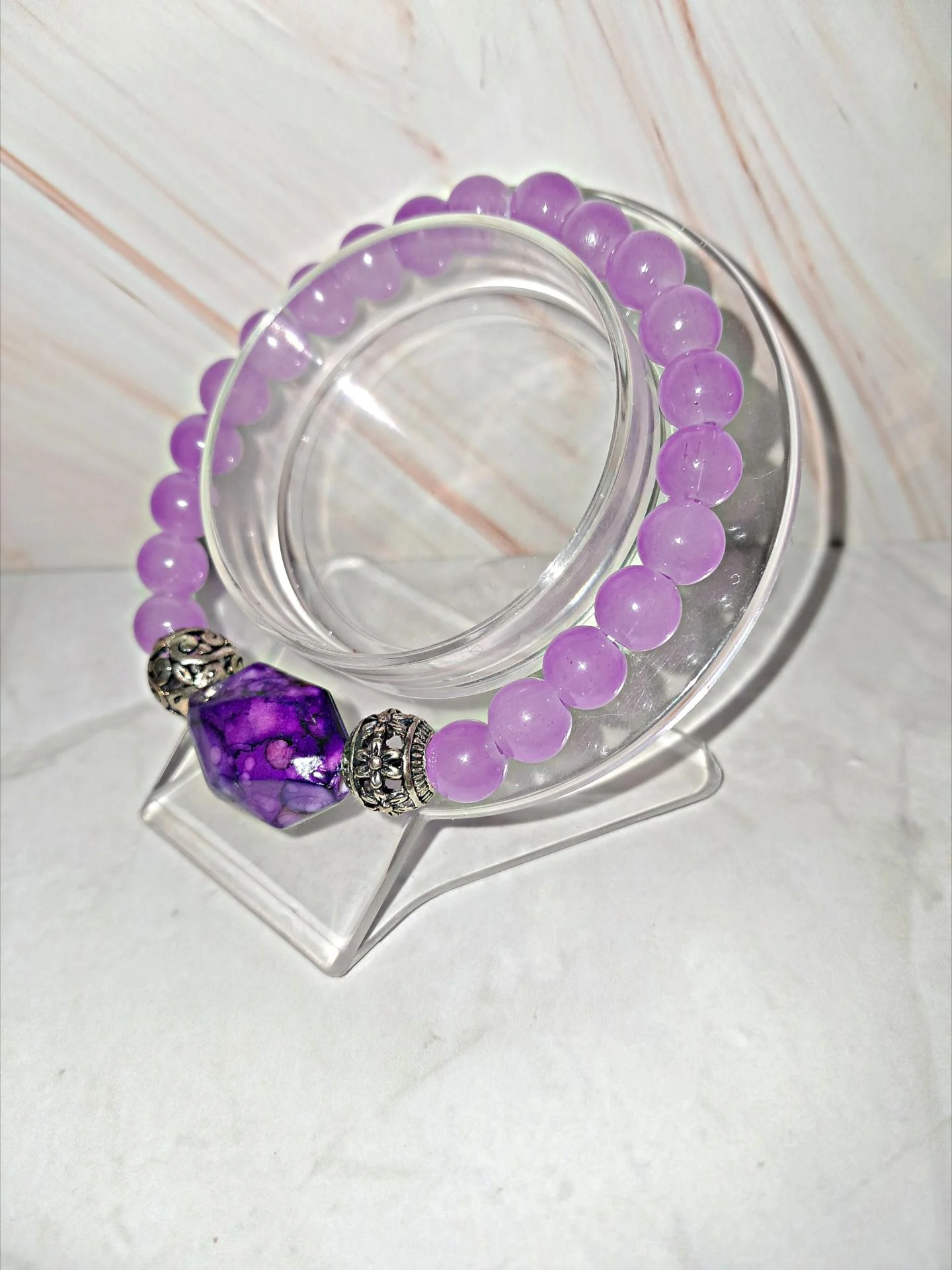 Bracelet extensible en perles de verre mauve ,sublimé par une grosse perle centrale irrégulière en acrylique violette marbré et des intercalaires en alliage de zinc de couleur argent antique.