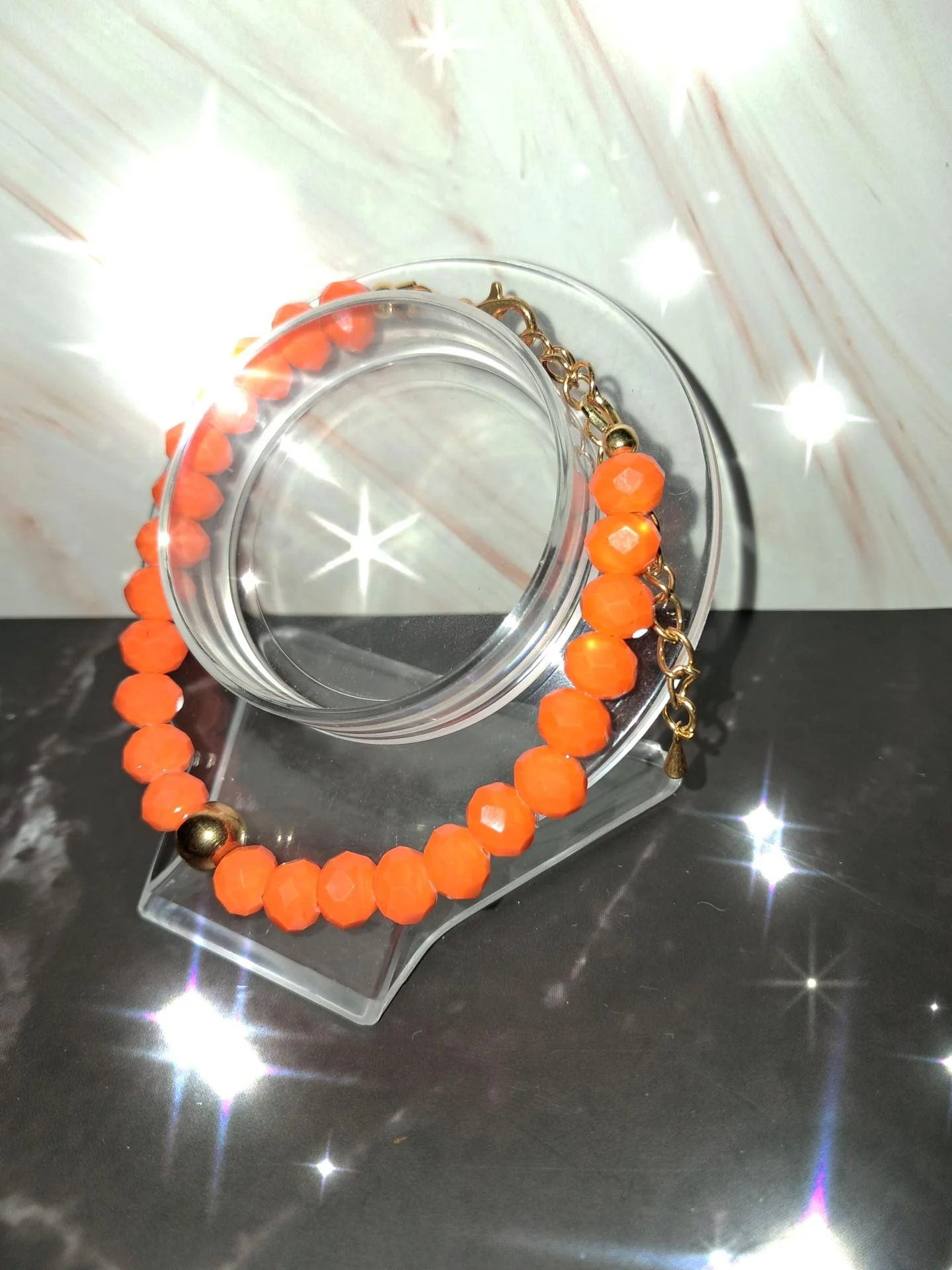 Bracelet réglable en perle facettées en verre de couleur orange vif,en son centre une perle dorée et chaîne en acier inoxydable dorée