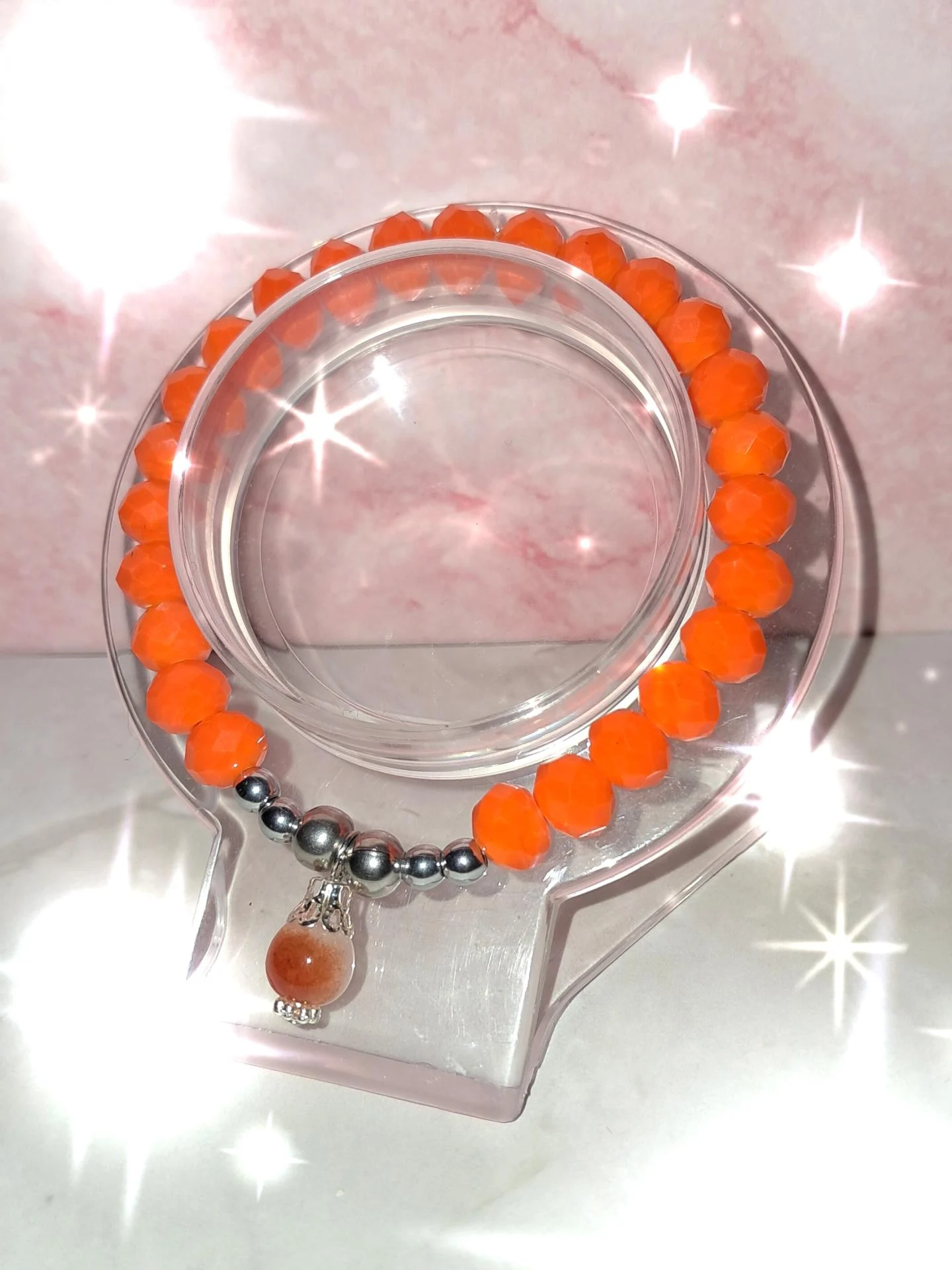 Bracelet orange -verre facetté-extensible et acier inoxydable