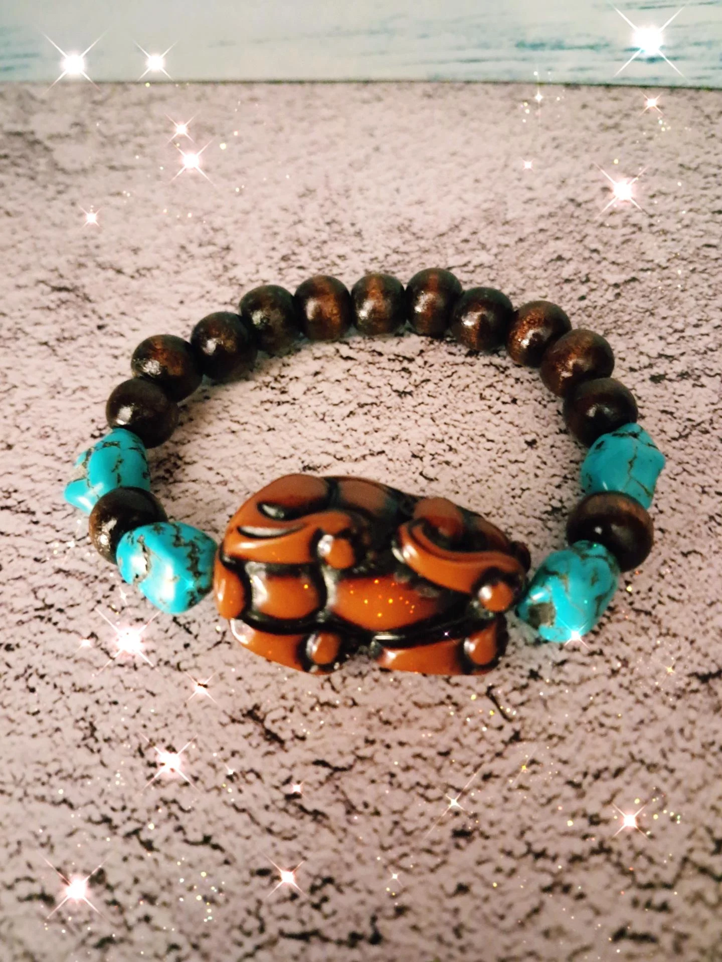 Bracelet extensible , en bois vernis , pierres turquoises & un Pixiu en résine