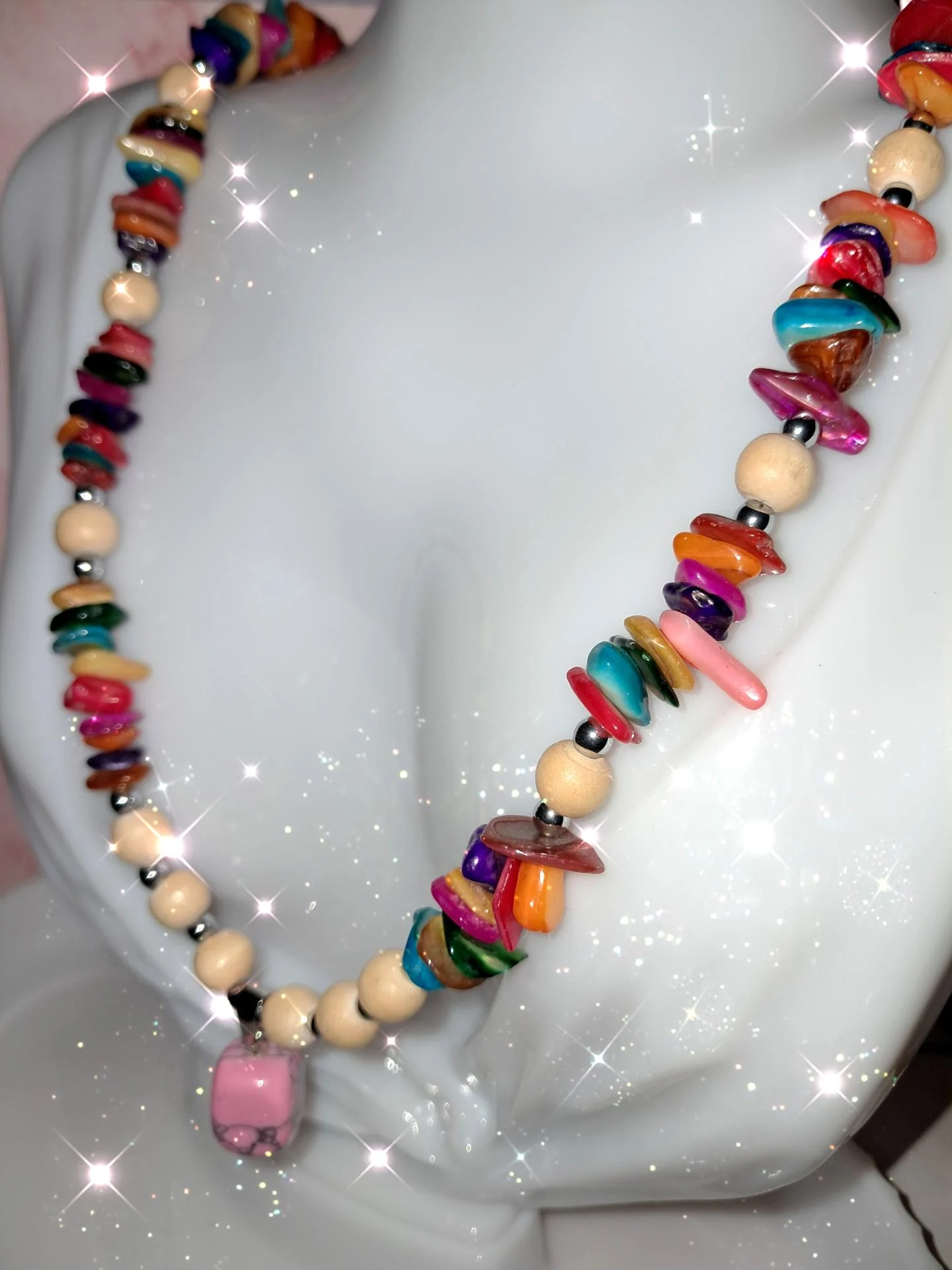 Collier lumineux composé de perles en verre concassé multicolores,perles de bois naturelles,perles en acier inoxydable argenté et pendentif en pierre rose.Une pièce joyeuse,colorée et unique.