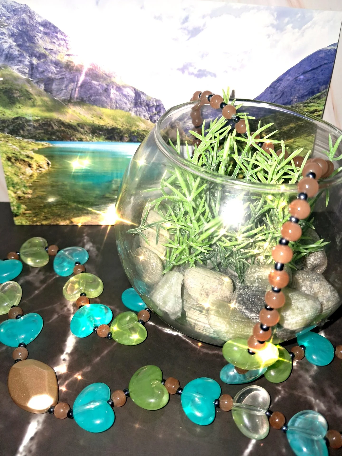 Collier élégant et lumineux composé de perles en verre marron translucide,de coeurs bleu et vert en acrylique,des perles en hématite noire et perle centrale dorée octogonale,pour un style doux ,coloré et féminin.