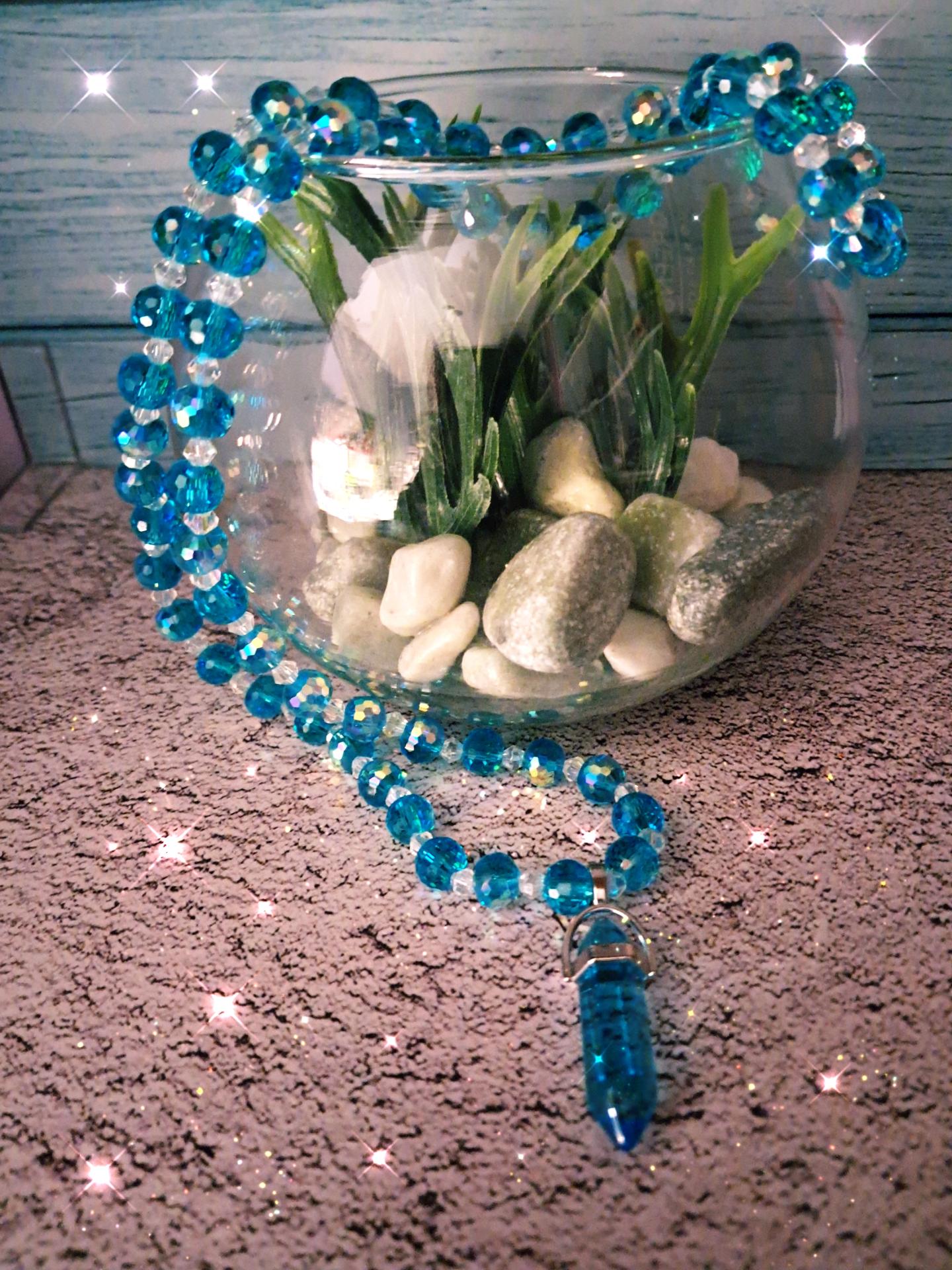 Collier éclatant composé de perles facettées bleu ciel & blanc transparent et d'un pendentif en cristal assorti.Un bijou lumineux qui allie élégance & fraicheur.