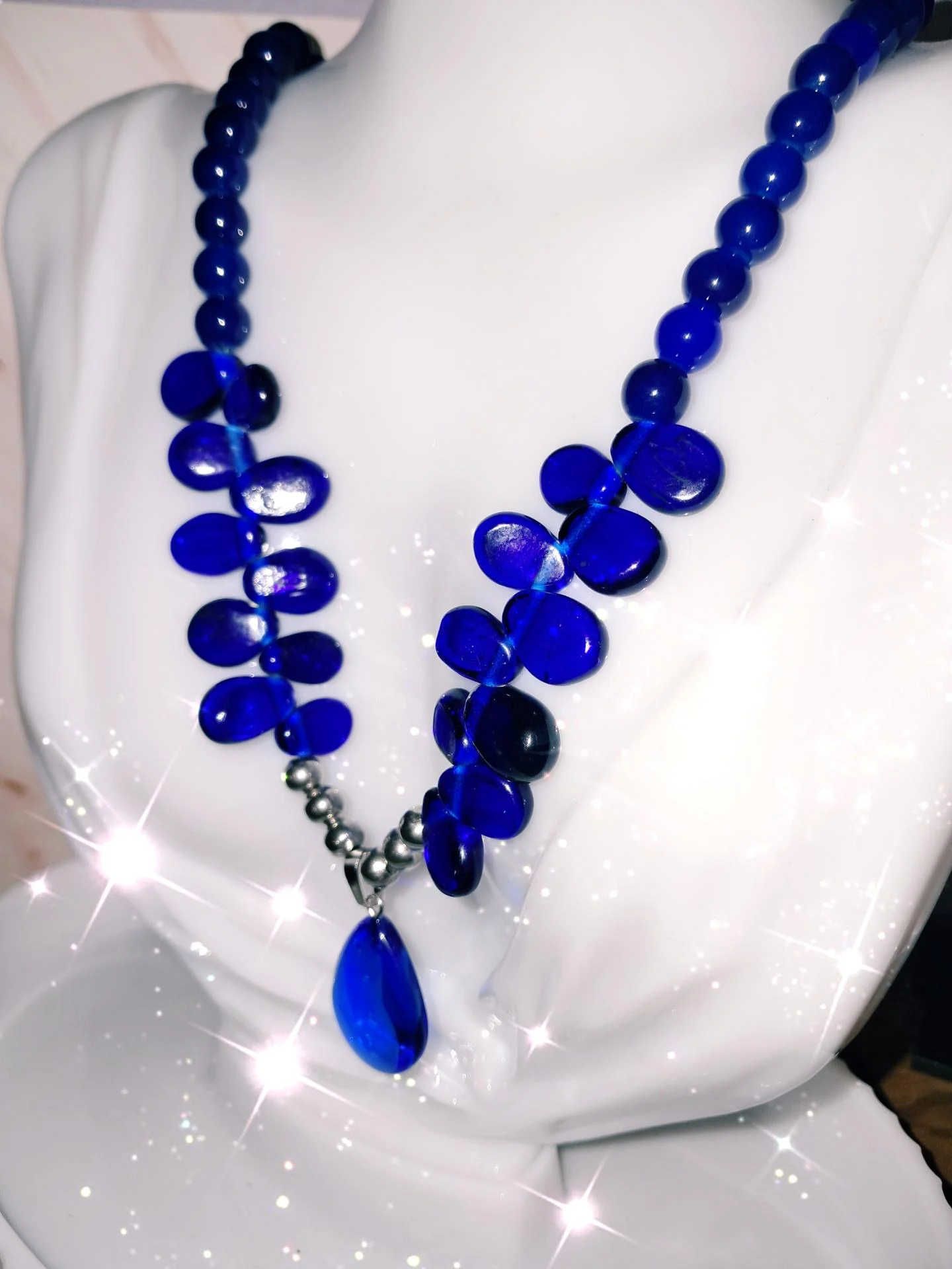Collier réglable en perles de verre bleu roi,orné d'un pendentif en forme de larme et de finitions en acier inoxydables.Une pièce élégante et lumineuse,parfaite pour apporter une touche raffinée à toutes vos tenues.