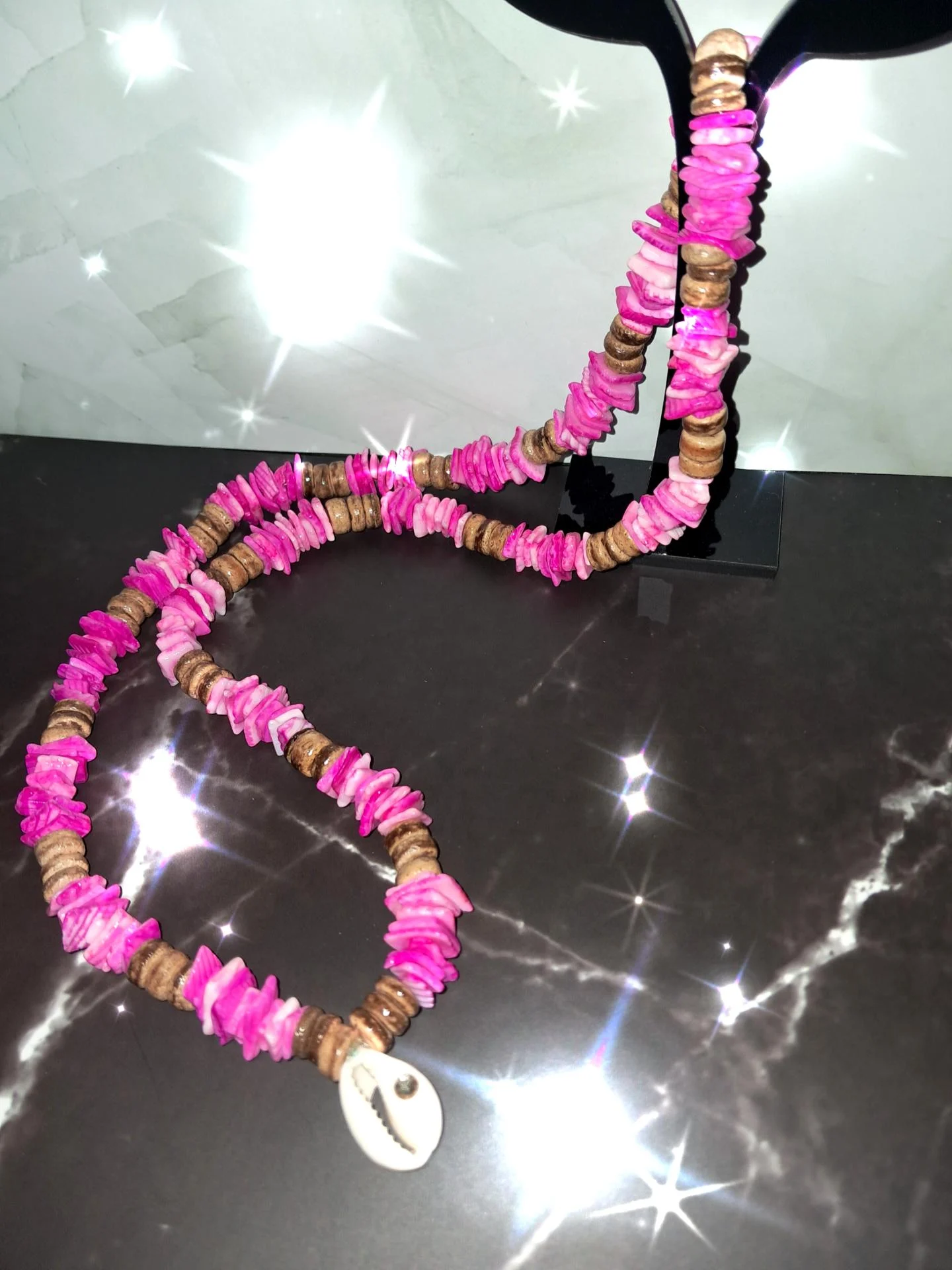 Collier des beaux jours,en coquillage vernis rose & en bois de coco.