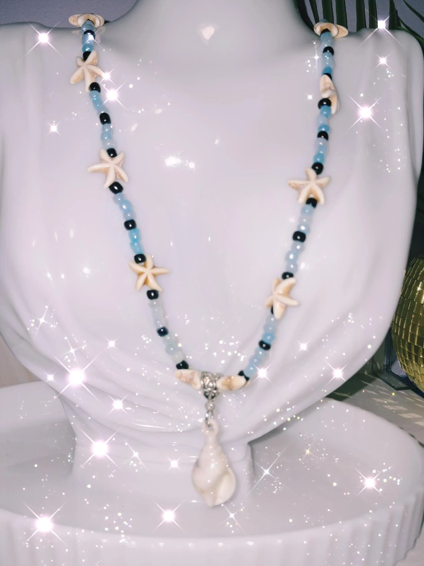Collier vêtu de perles de rocaille avec plusieurs tons de bleu ,laissant apparaître des perles noires entre les étoiles en pierre reconstituée. Pendentif coquillage,marbré en acrylique.