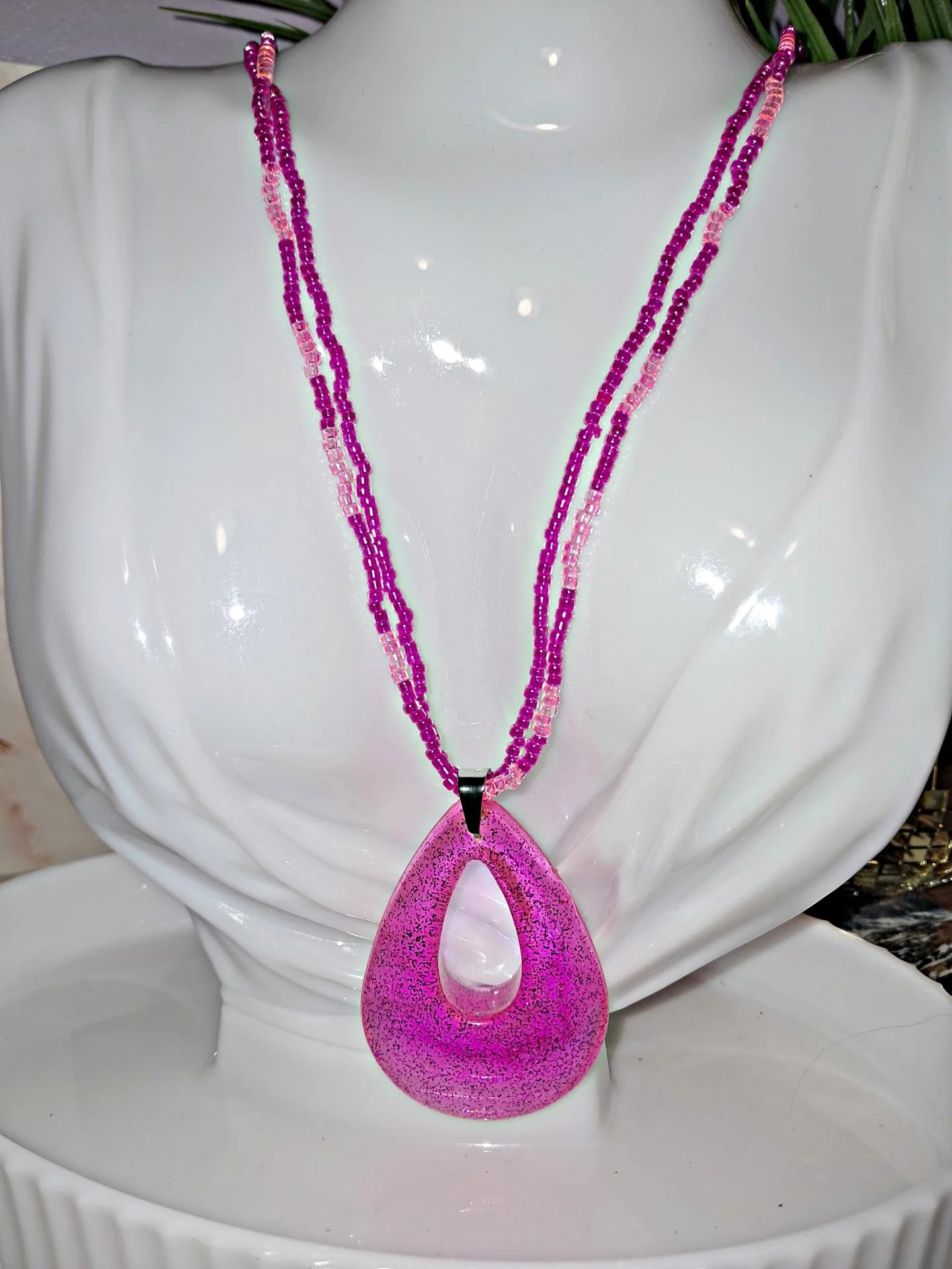 Collier double rang en perles de rocaille rose intense,sublimé par un pendentif goutte en résine bubble gum. Inspiré par l'été ,la joie et la sérénité.