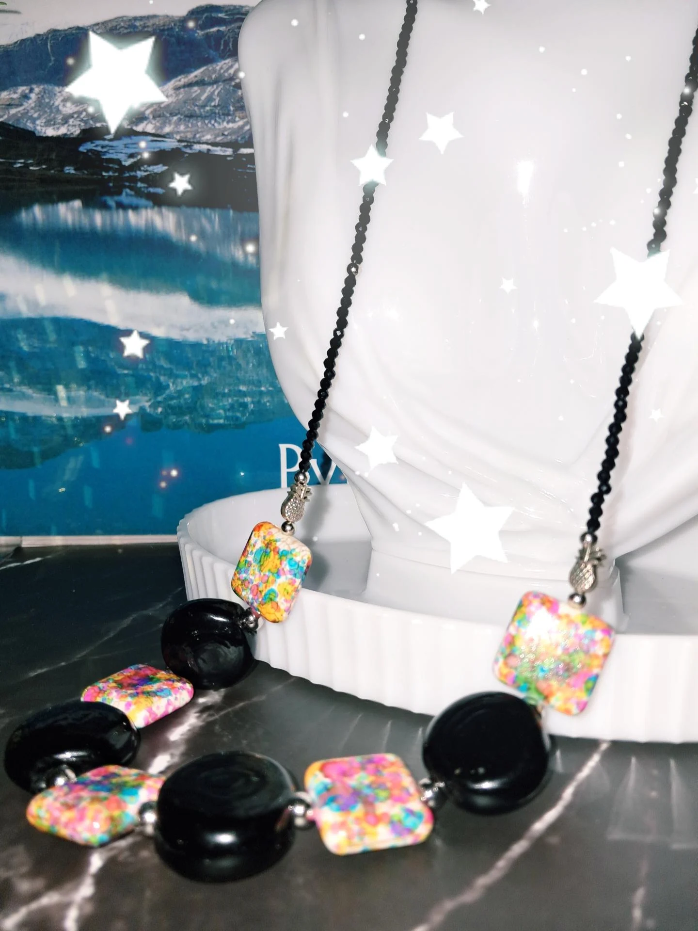 Collier artisanal audacieux et vibrant,mêlant perles carrées multicolores, céramique noire en perles et perles en verre.Une création expressive qui célèbre la créativité et la force intérieure.