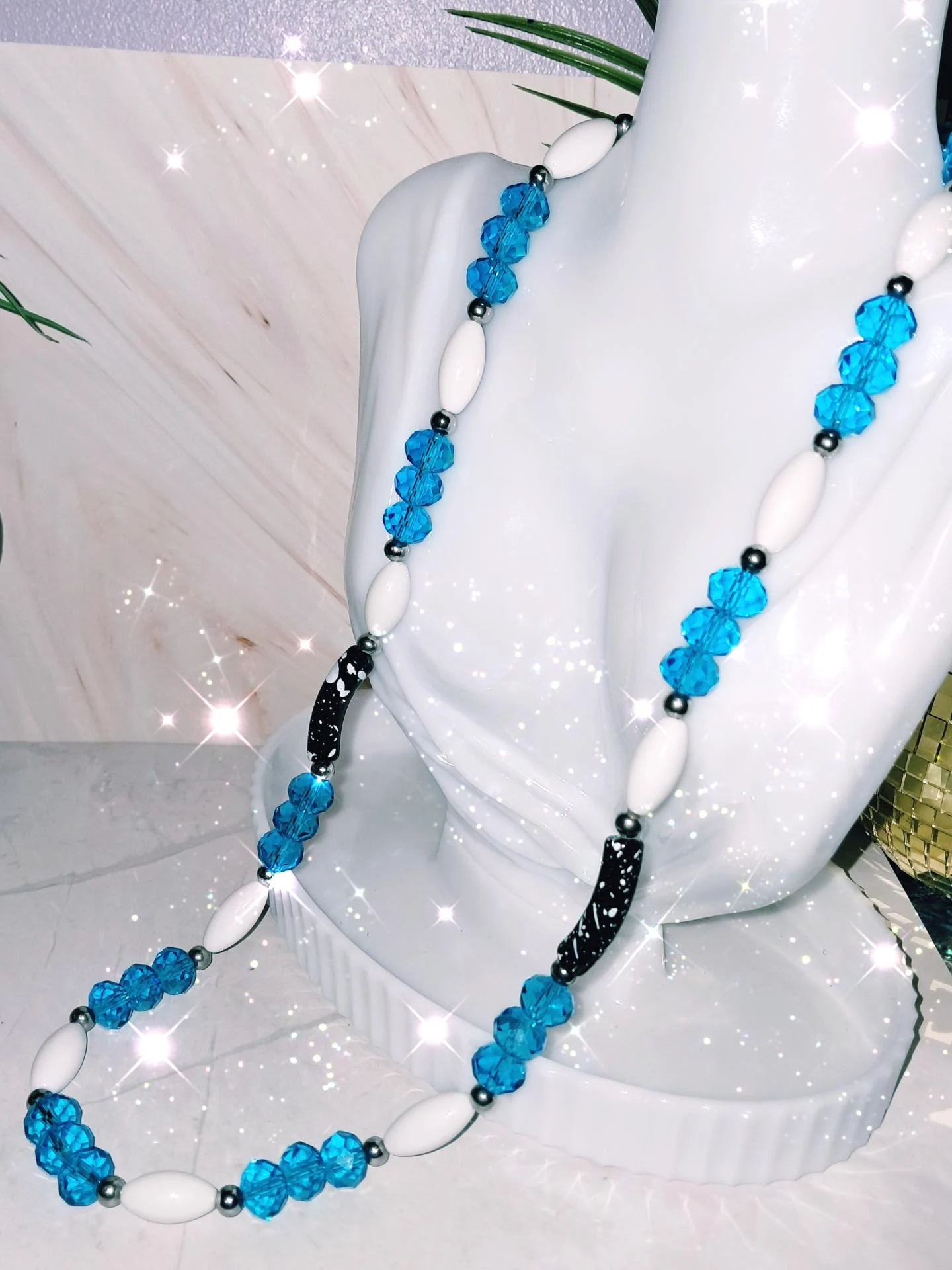 Superbe collier,fait main,aux couleurs éclatantes : Perles de verre facettées bleu intense,perles blanches ovale en acrylique,cylindre noir et blanc et perles d'espacement en acier inoxydable argenté. Un bijou lumineux ,élégant et unique qui capte la lumière et sublime toutes les tenues.